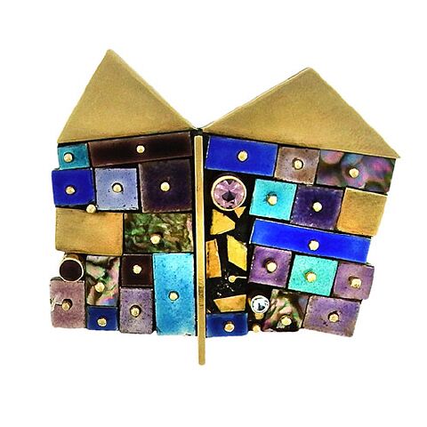 Earl Pardon’s colorful palette is in pure form here in a brooch from the 1980’s, a collage of kiln-fired enamel tiles in cobalt blues, purples and aquas, with abalone, 14K gold squares, amethyst, ruby and blue topaz gems set in 14K bezels, all on a sterling back. The brooch measures 1-3/4″ x 1-1/2″.