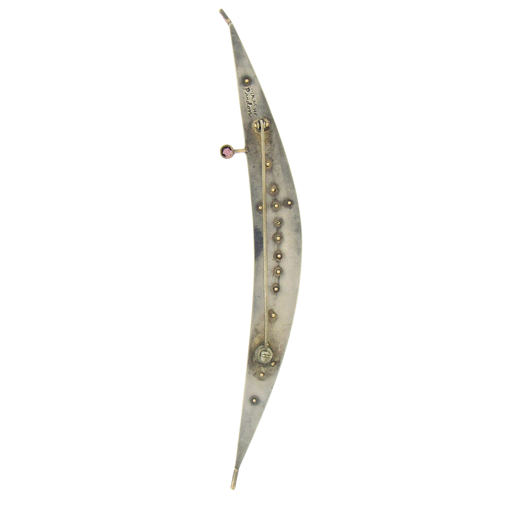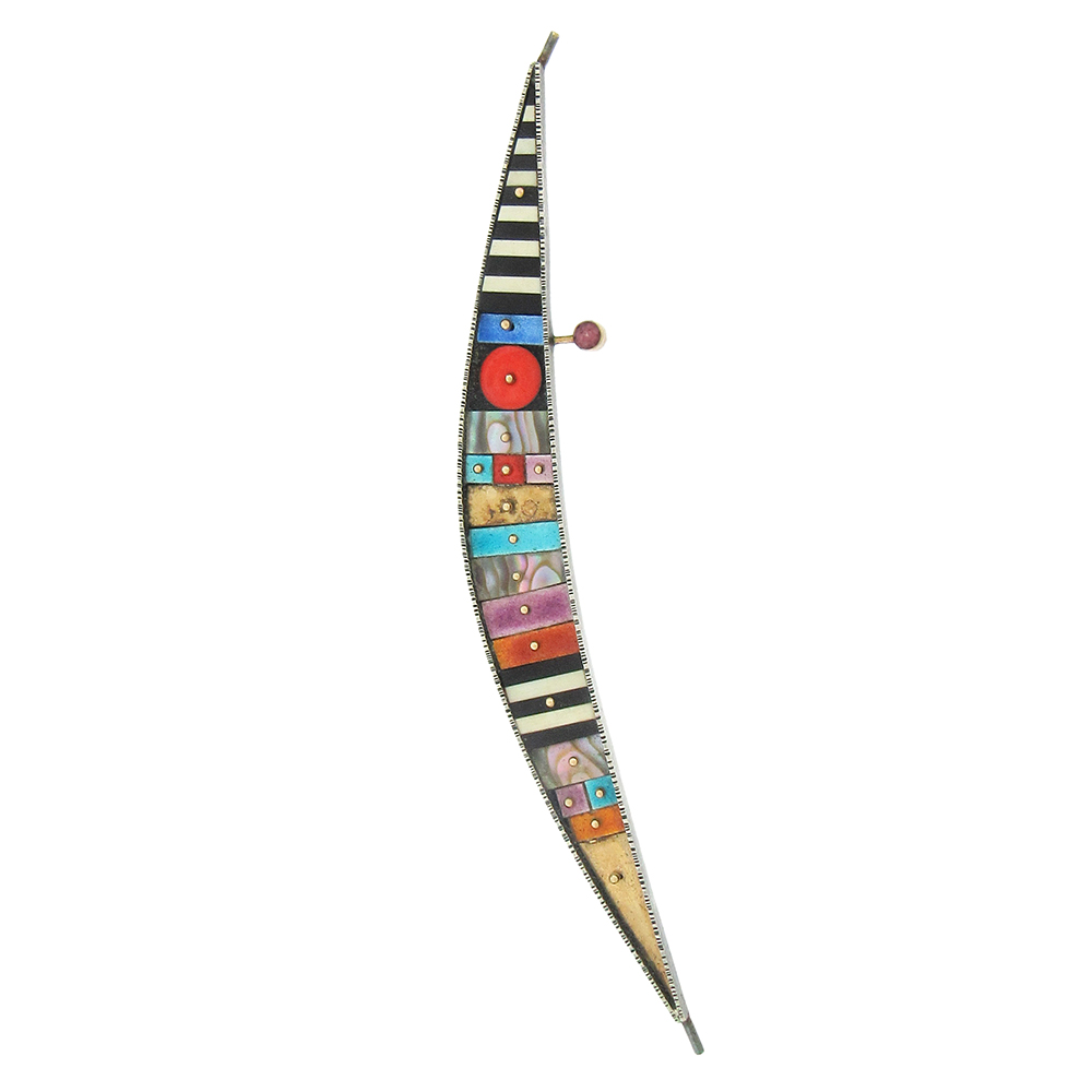 Earl Pardon’s circa 1980’s brooch is an exploration of his interest in the late 70’s and early 80’s in organic materials like wood and bold, almost calligraphic or brush-stroke forms, like this long curved brooch. The colorful enamel mosaics, each one individually created and inlaid in sterling, curve in a dramatic crescent, set with wood, bone, abalone, enamel tiles and 14K gold, with a rhodolite garnet accent. Pardon’s colorful jewels are a signature style for this Modernist whose artistic investigations in precious metal, from 1953 to 1991, are museum-worthy works. Brooch measures 6″ x 5/8″.