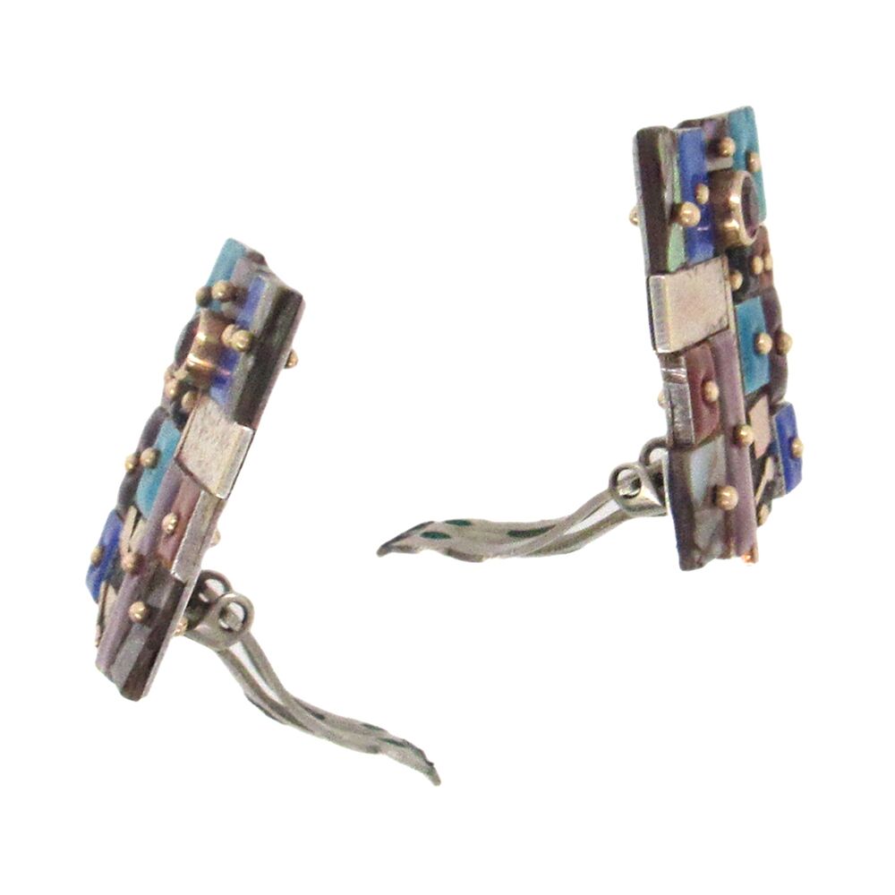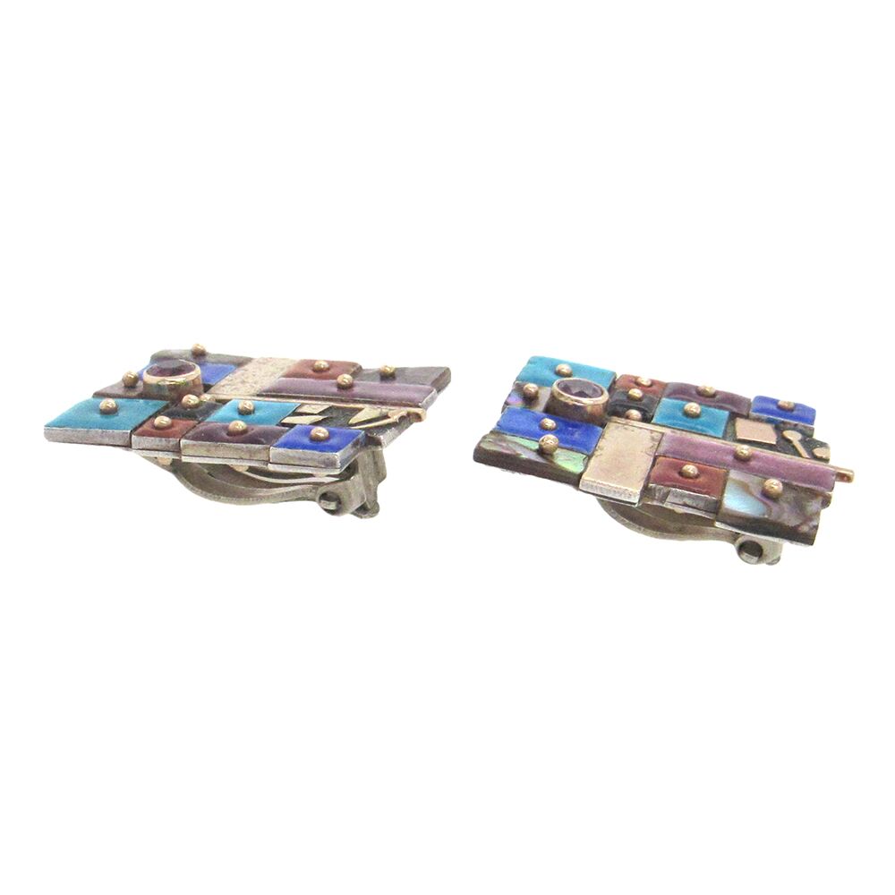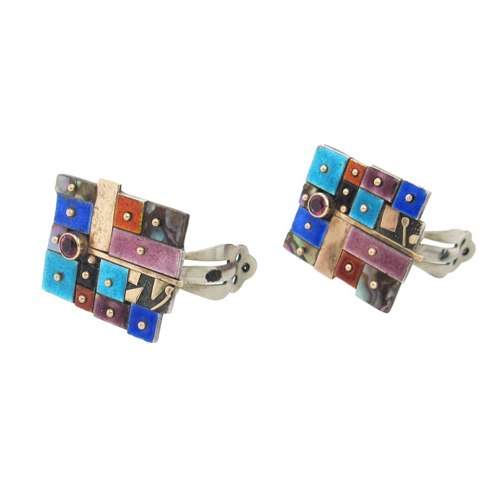 From Earl Pardon (1926-1991), his signature enamel mosaic tile clip-on earrings, circa 1980’s, set with rhodolite garnet, abalone , 14K gold and enamel tesserae, silver clip backs. The earrings measure 3/4″ x 1″.