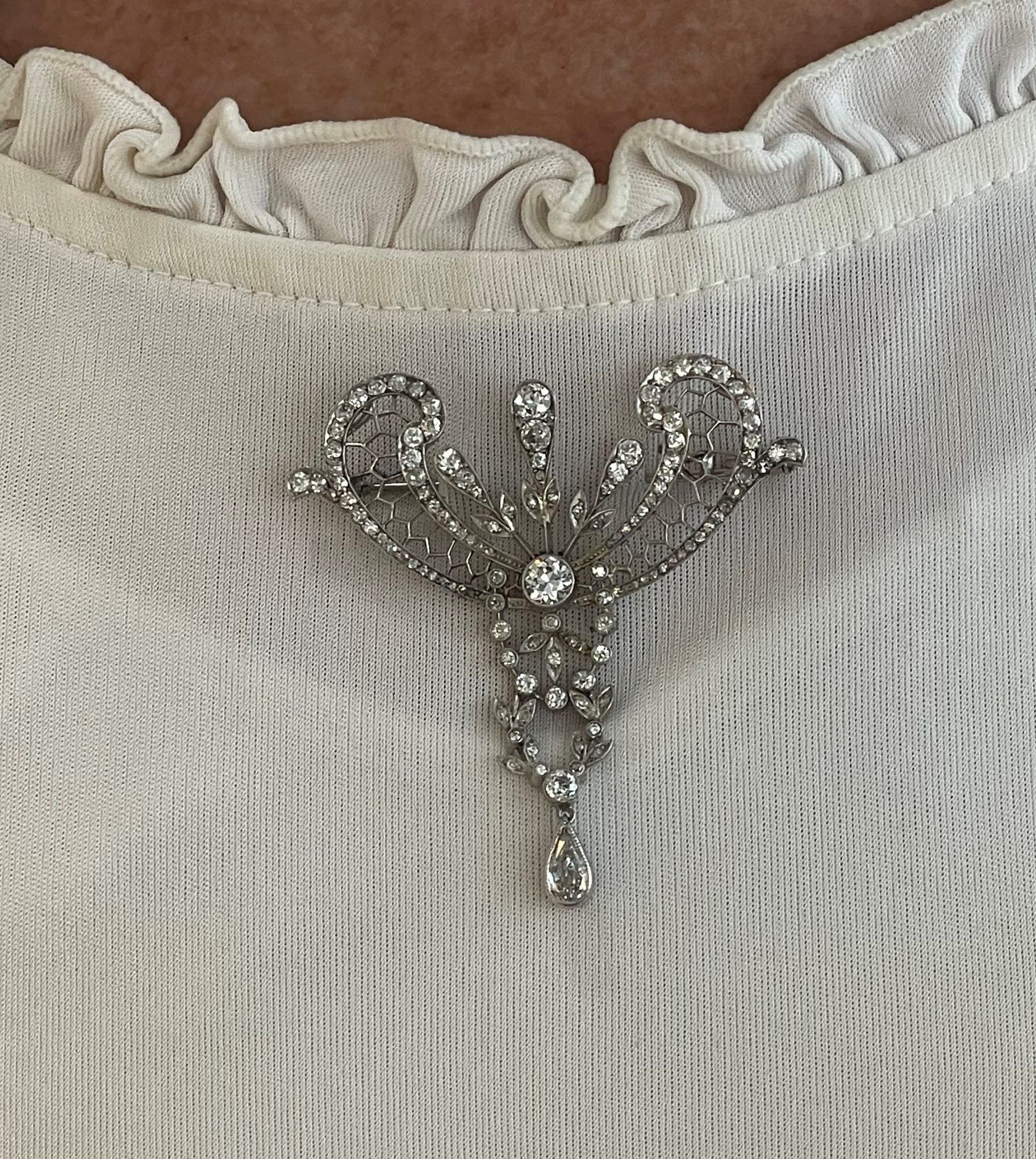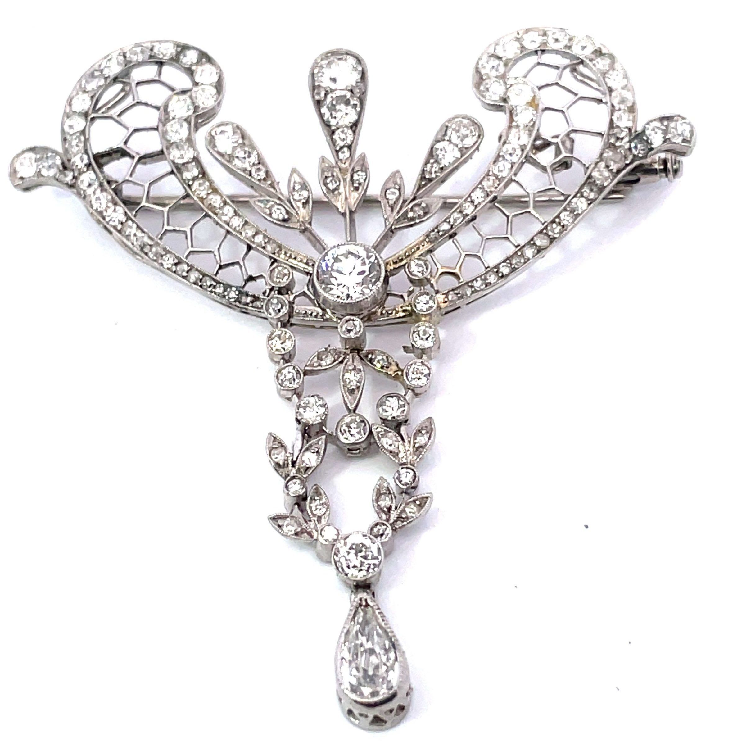 Diamond Edwardian festoon brooch, circa 1915, set with approx. 6 cts tw diamonds. The diamonds — old European cut, rose-cut and single cut with a pear-shape diamond drop– are set in filigree platinum measuring 2-1/8″ x 2-1/4″.