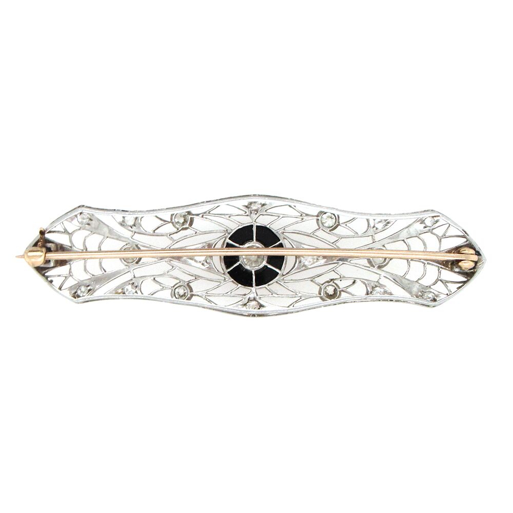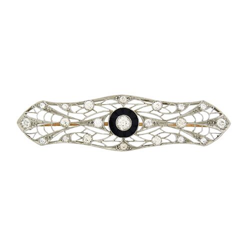 This diamond filigree pin, circa 1930’s, is a lacy spiderweb of platinum, set with old-European-cut diamonds, with a center of black calibre-cut onyx. 18K gold pin stem. 3/4″ x 2-1/2″ long.