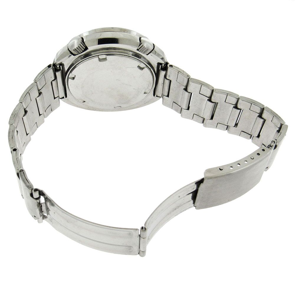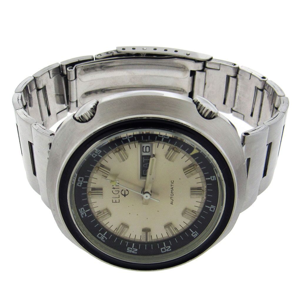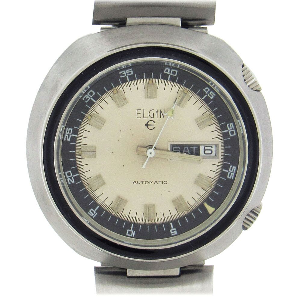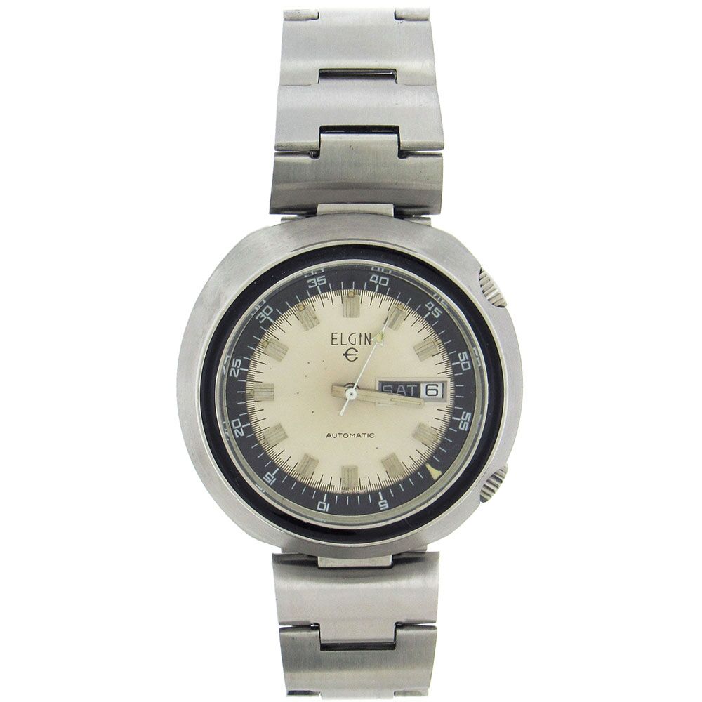 Designed as diver’s watch, this stainless steel Elgin Ref. 1501 is a 1970’s day-date automatic with bracelet. The cushion-form case measures 43mm diameter, top crown rotates the internal 60 minute black timing bezel and bottom crown winds and sets the watch. The silver dial has applied steel baton hour indexes, day and date aperture at 3, white center second sweep hand. The movement is self-winding, 17 jewels, with day-date display; standard quick-set date function when crown is pulled out to the first setting position; time setting in second position; 21,600 BPH; Swiss Made. The movement is warrantied by Aaron Faber for 1 year.