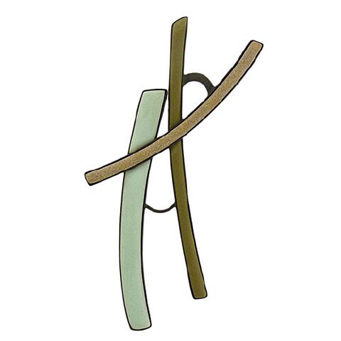 Ginny Whitney’s sketch-like color composition brooches are expressive forms to wear, with their remarkably fine color combinations — here, seaglass, olive and taupe — in kiln-fired enamel on fine silver, set in darkened sterling silver, and stone-ground finished by the artist to achieve the matte finish. 4-1/2″ x 2-1/4″ .