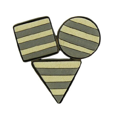 Ginny Whitney is known for the remarkable kiln-fired enamels she creates, painstakingly setting the darkened cloisonné wire to create the stripes in this geometric brooch titled “Homage to Jasper”, then inlaying layers of the gray and cream glass enamels, firing each layer in the kiln, to achieve this tailored composition set in oxidized sterling silver, measuring 1-3/4″ x 1-7/8″.