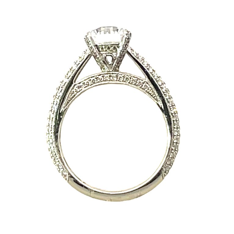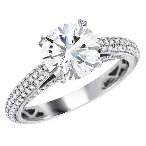 Simon G’s micropavé engagement ring mounting is an elegant, beautifully detailed design with diamonds set on the sides of the ring, on sweeping V-shape of the center, as well as the prongs. Set with 0.70 cts diamonds, designed for a 2 carat center gem.