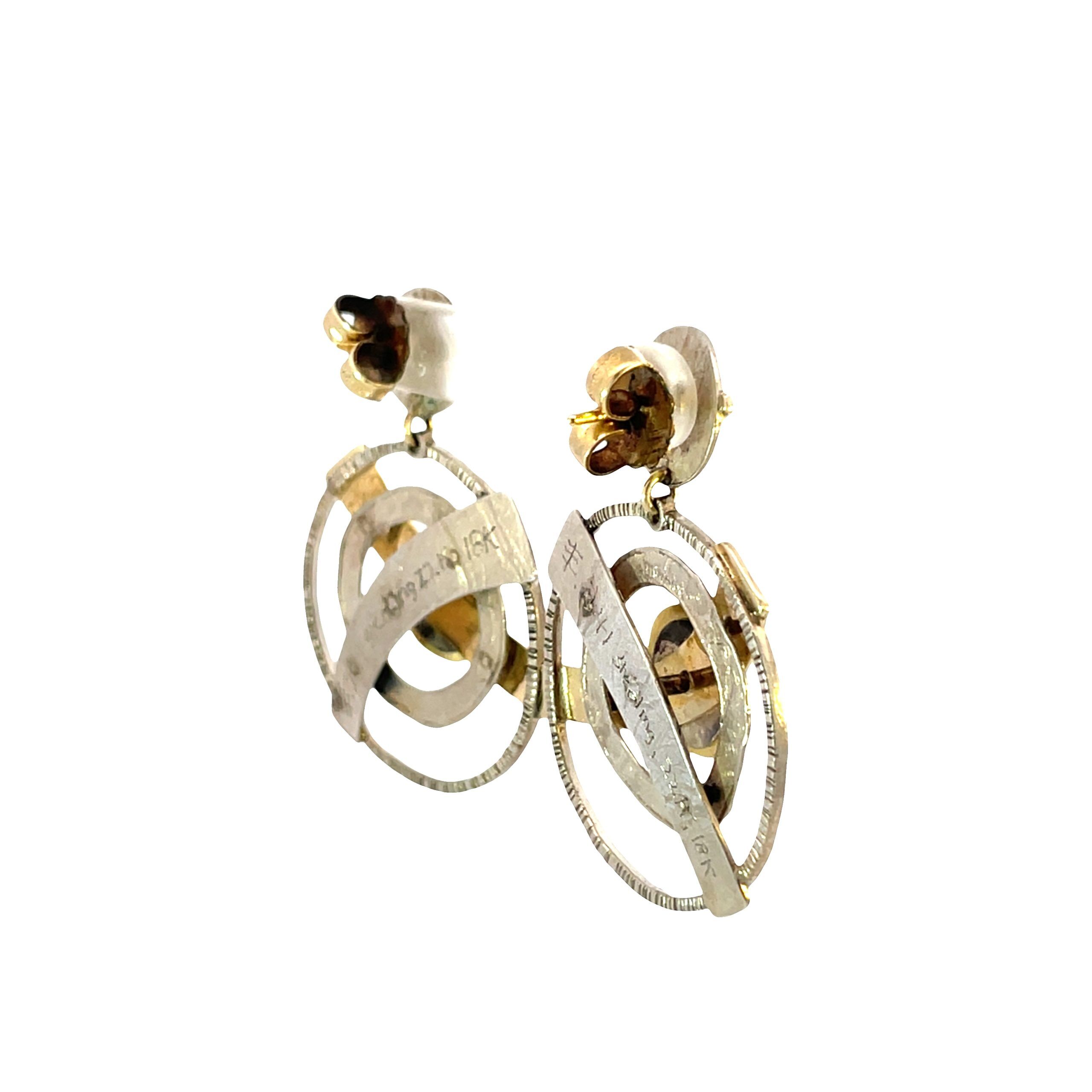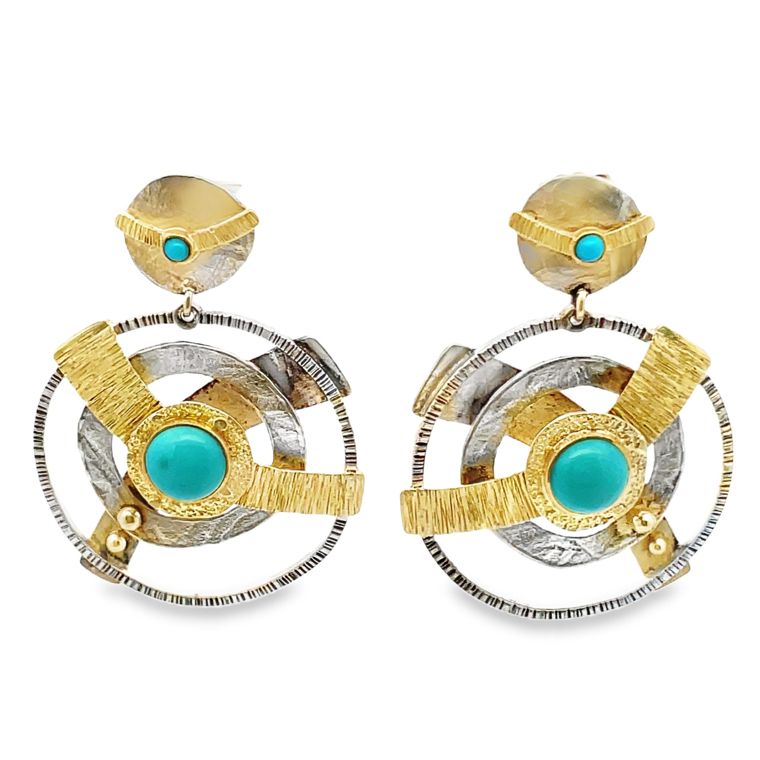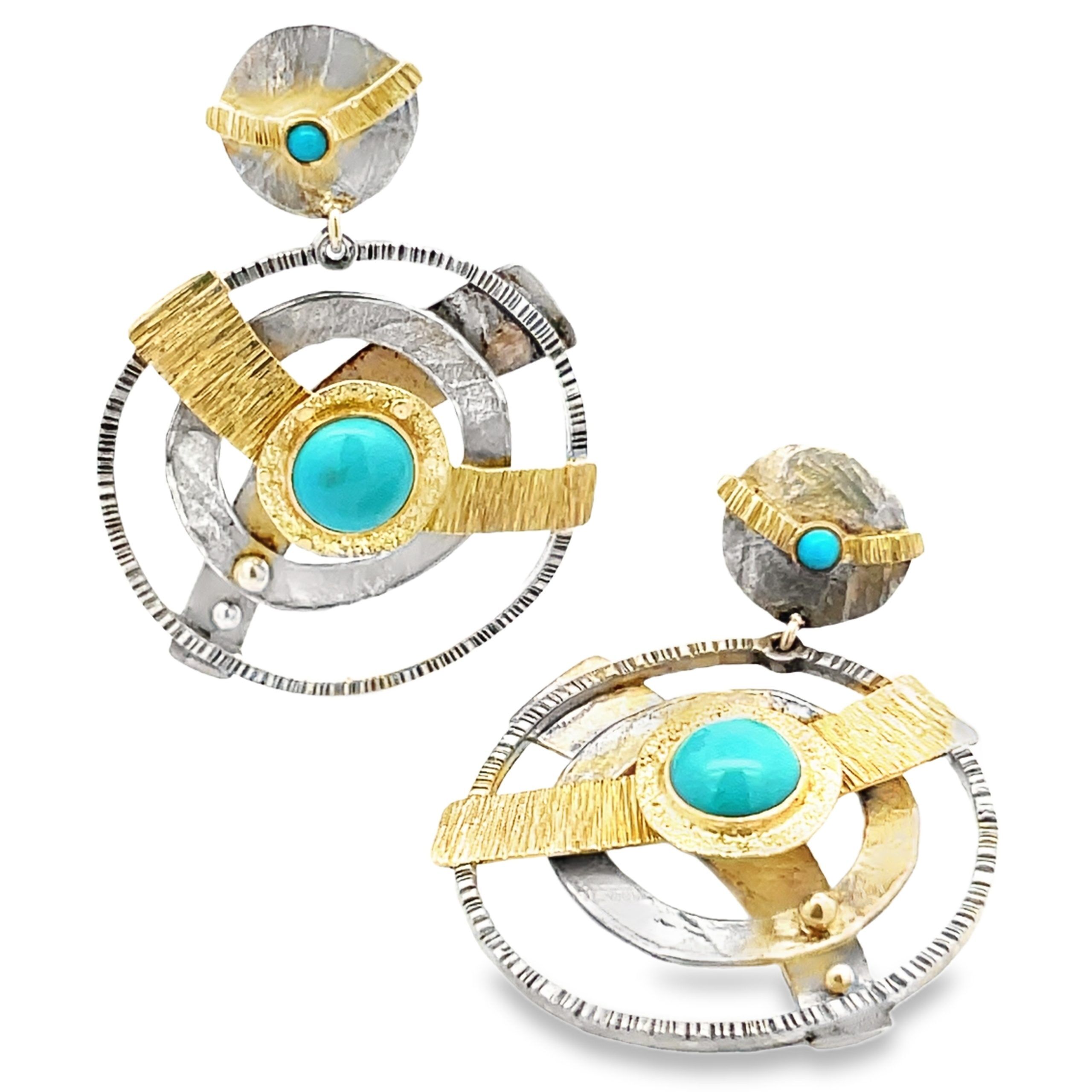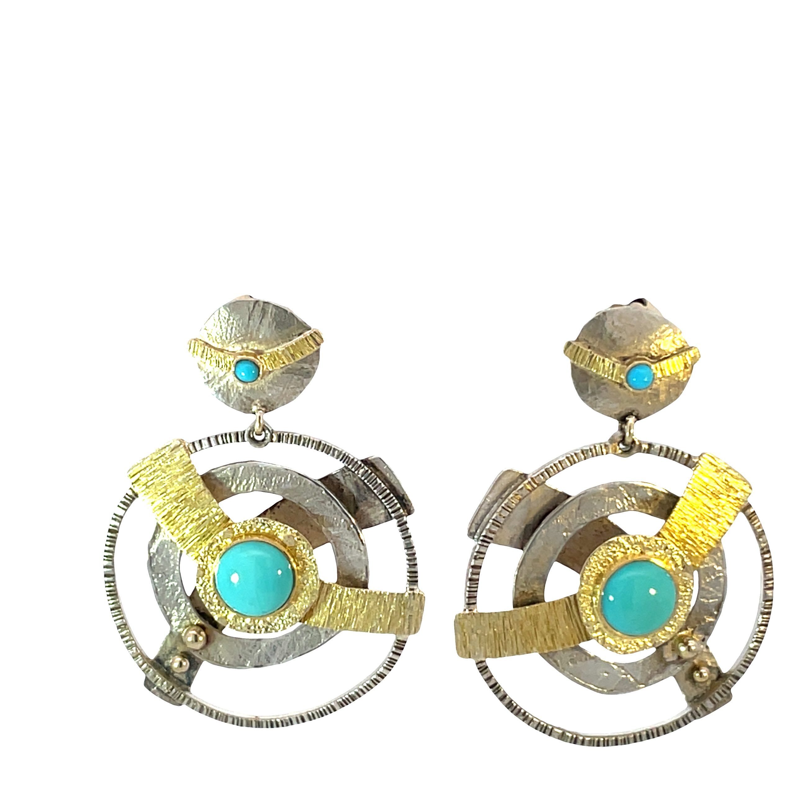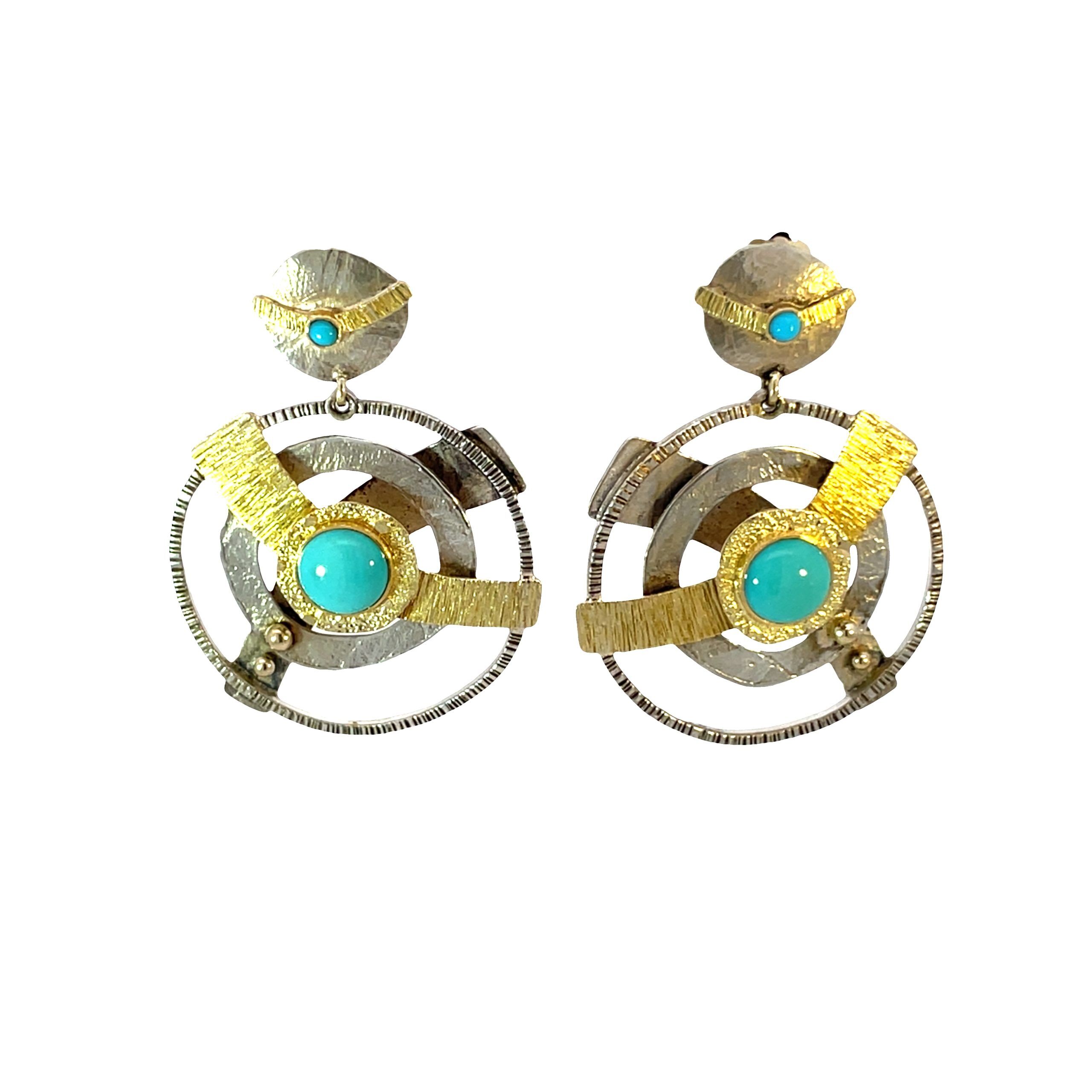 Eric Russell earrings, circa 1988, are large dangling whirligig style drops set at centers with turquoise cabochons, constructed in textured sterling silver and 18K gold. The circular drop measures 1-1/2″ diameter, the tops are 1/2″ d, overall length 1-3/4″.