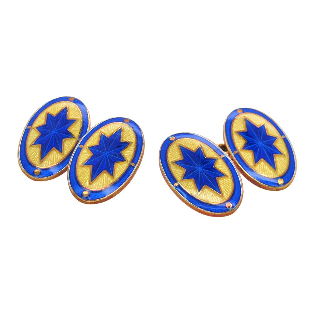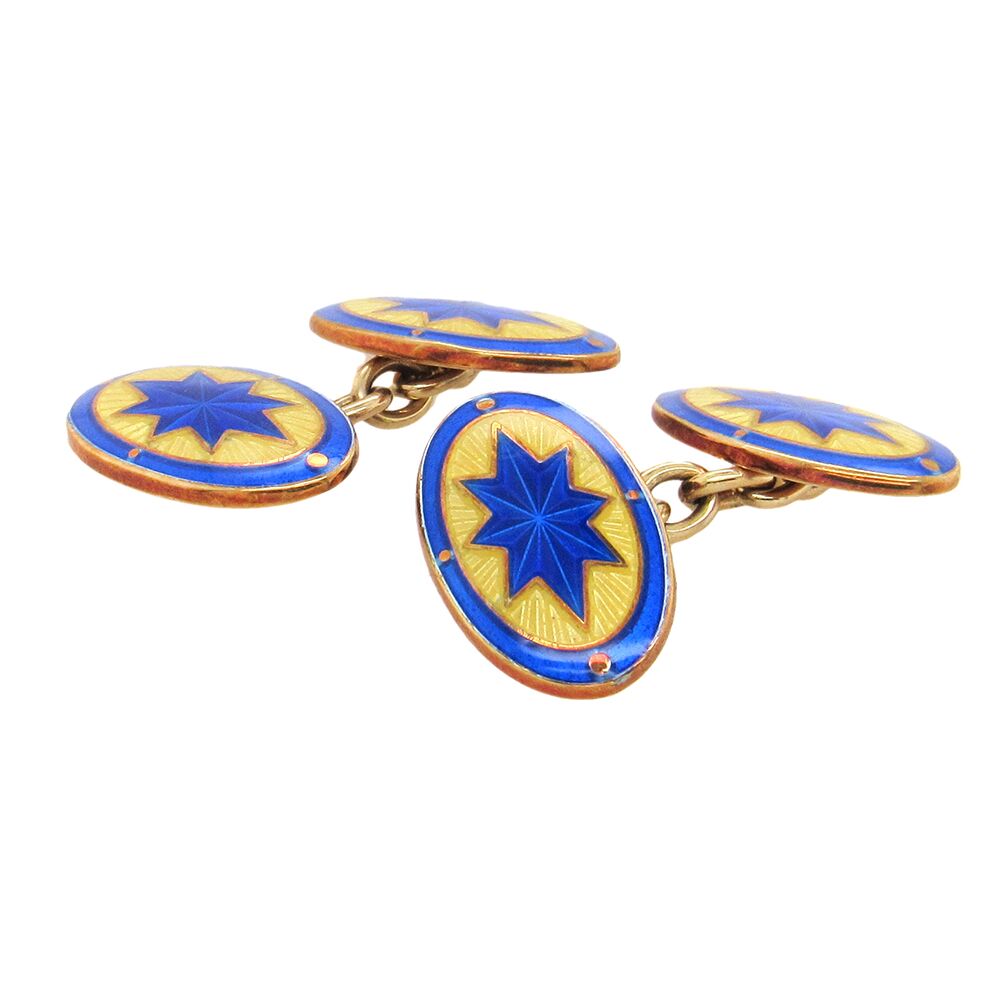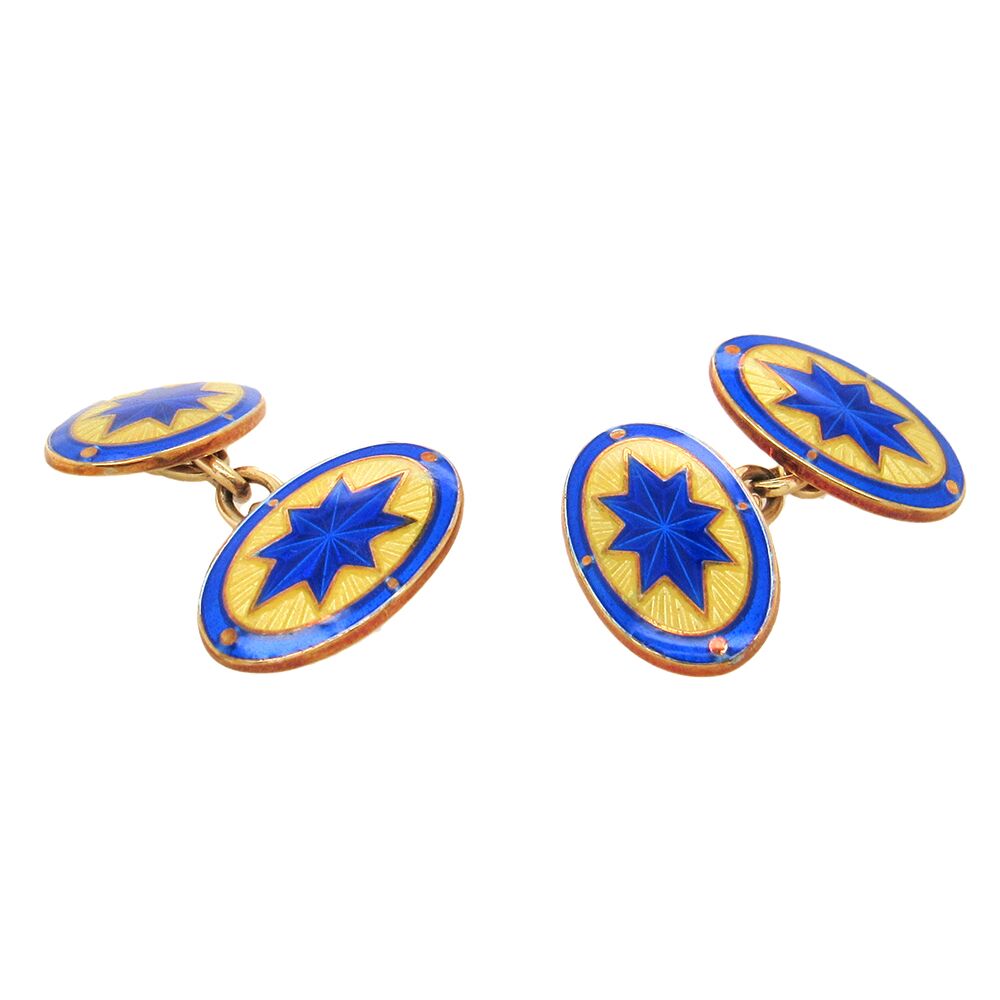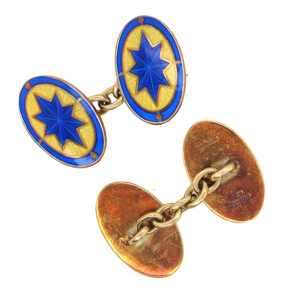 9K gold cobalt blue and citron yellow starburst guilloche enamel double-sided ovals, these estate cufflinks measure 3/8″ x 3/4″, dated 1998, hallmarked.