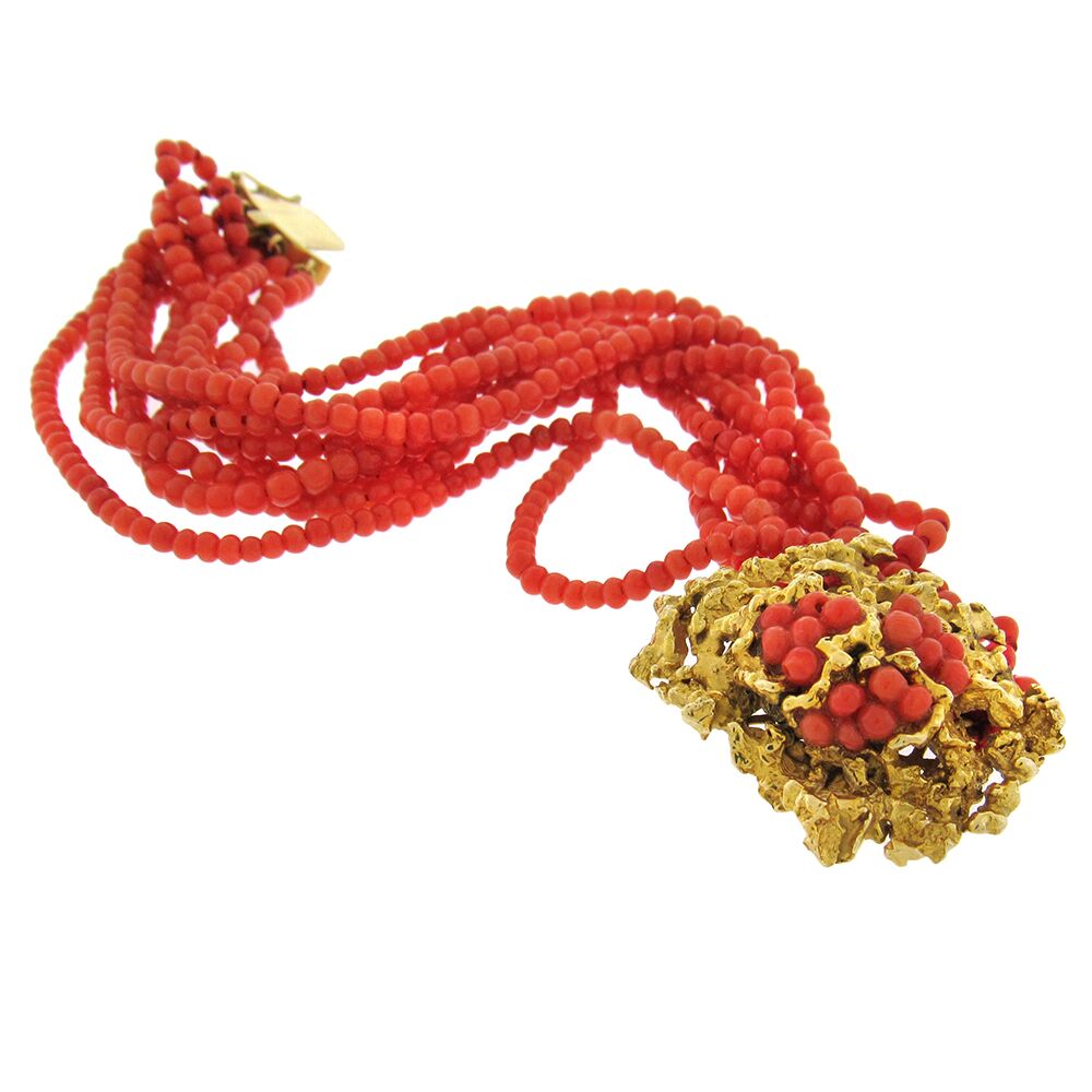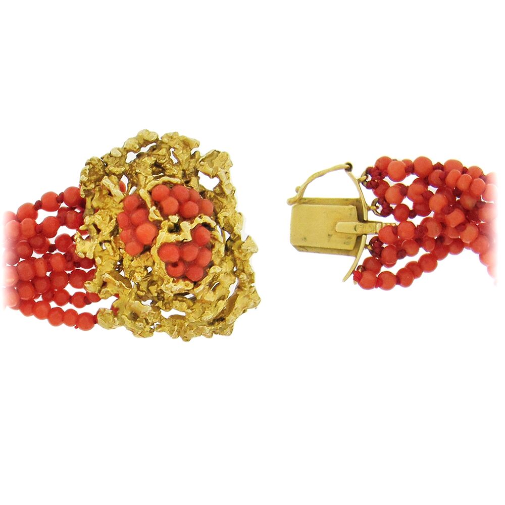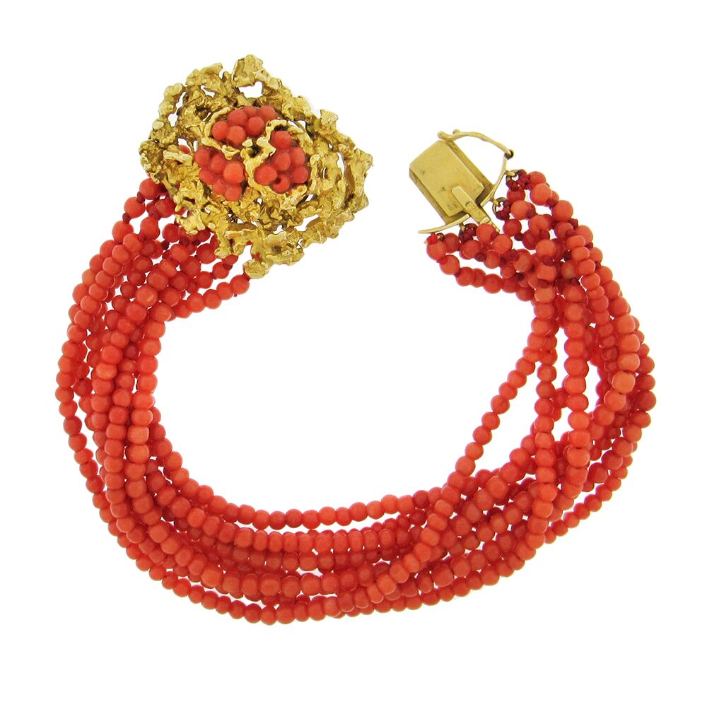 14K coral bead bracelet, circa 1960’s, 1-1/8″ x 7″ long, with nine strands of 3mm coral beads, and a 14K gold nugget texture clasp set with coral beads.