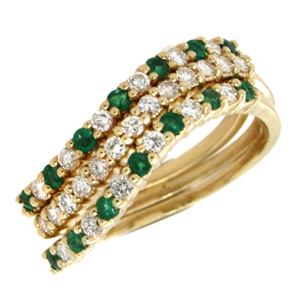 Set of three curved sparkling emerald and diamond stack rings, size 5, set in 14K yellow gold. Measure 3/4″ x 1/4″ together, can be worn separately.