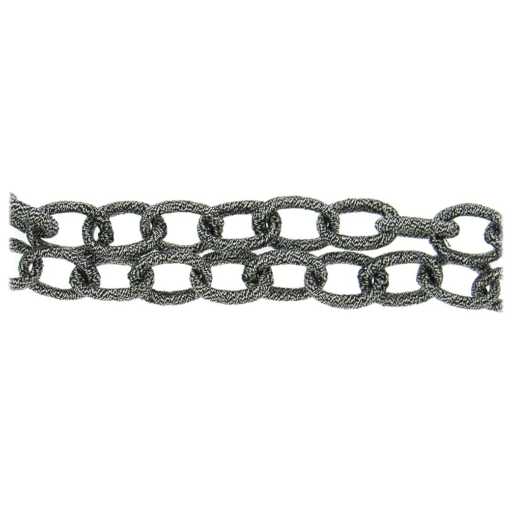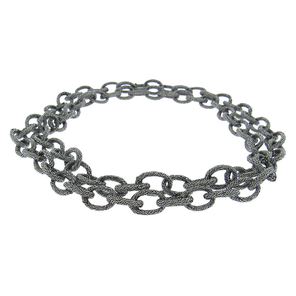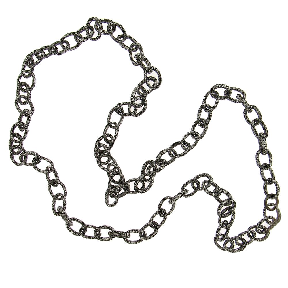 Fashion silver lurex wrapped non-metal oval link chain, 32″ long, slips over the head. Each oval link is 1/2″ x 3/8″.