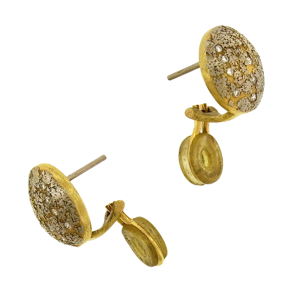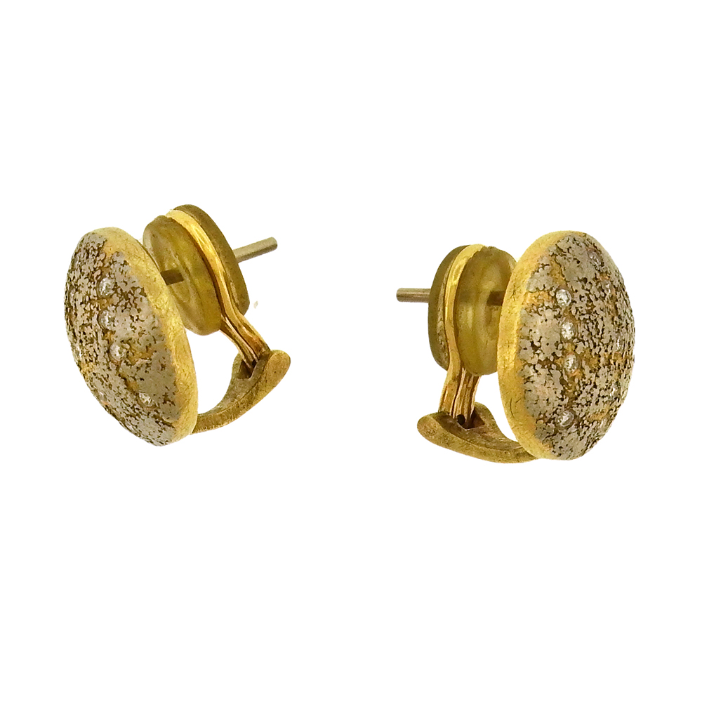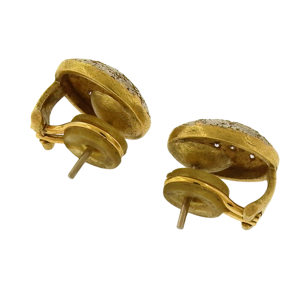 These grid-patterned 18K yellow gold, platinum and diamond earrings from German designer Gellner measure 1/2″ in diameter, with 18K gold posts and omega backs.