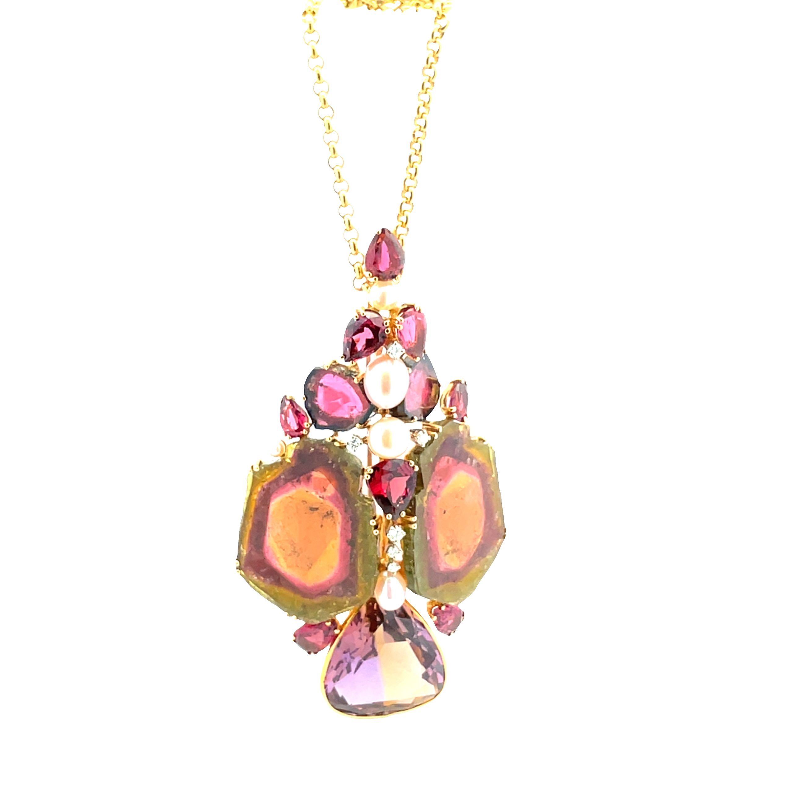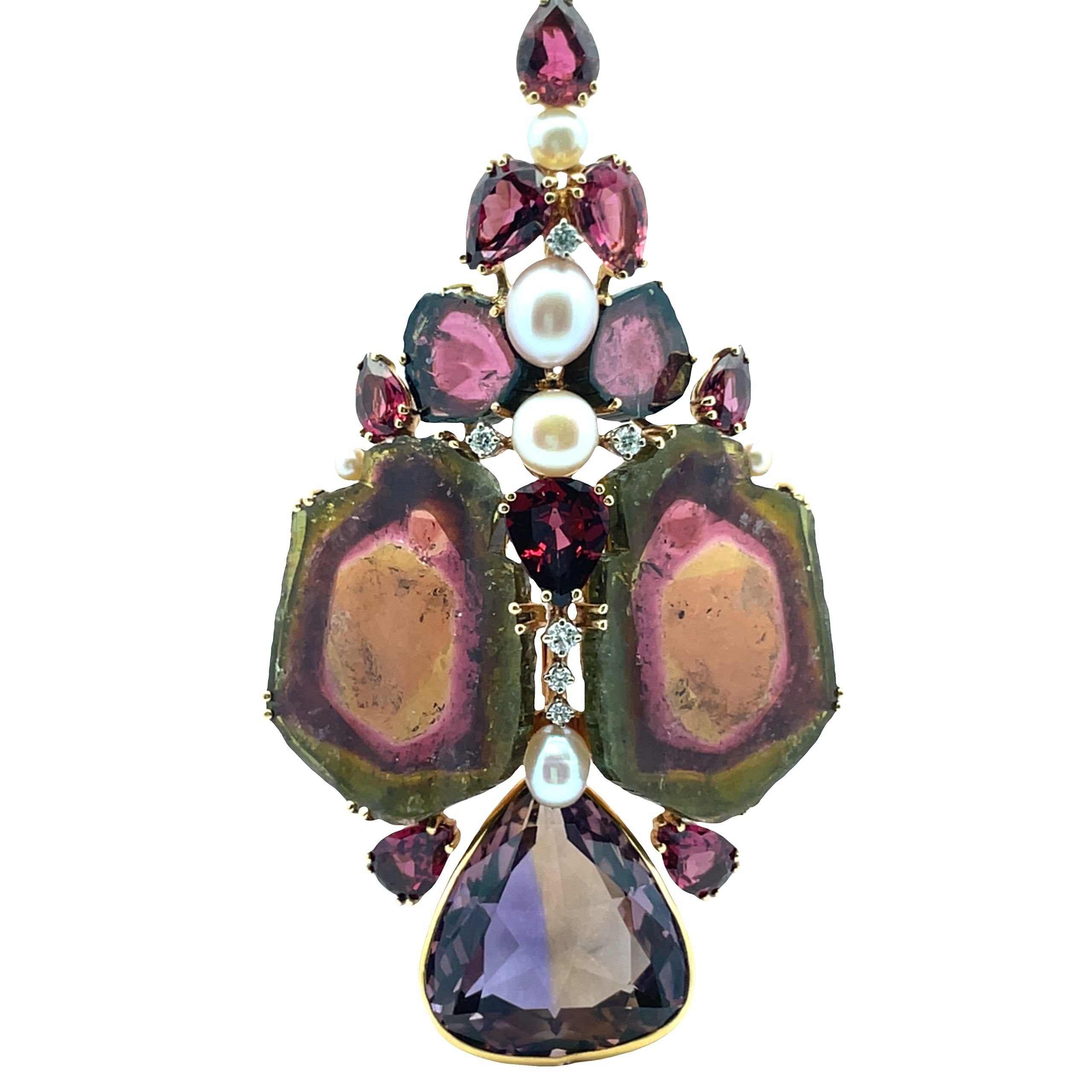 Gilbert Albert (1930-2019) created one-of-a-kind jewels, using unusual gemstones and his design esthetic inspired by nature and the sacred beetles of Egyptian jewelry. Here, he clusters remarkably vivid gems — tourmaline slices in raspberry and tri-colors of red, green and yellow-gold., faceted pear-shape tourmalines, and a bi-color ametrine drop at bottom, all accented with freshwater pearls and diamonds. The brooch/pendant measures 2″ x 3-1/2″ x 3/8″ deep. Can be worn over any chain or coil as a necklace.