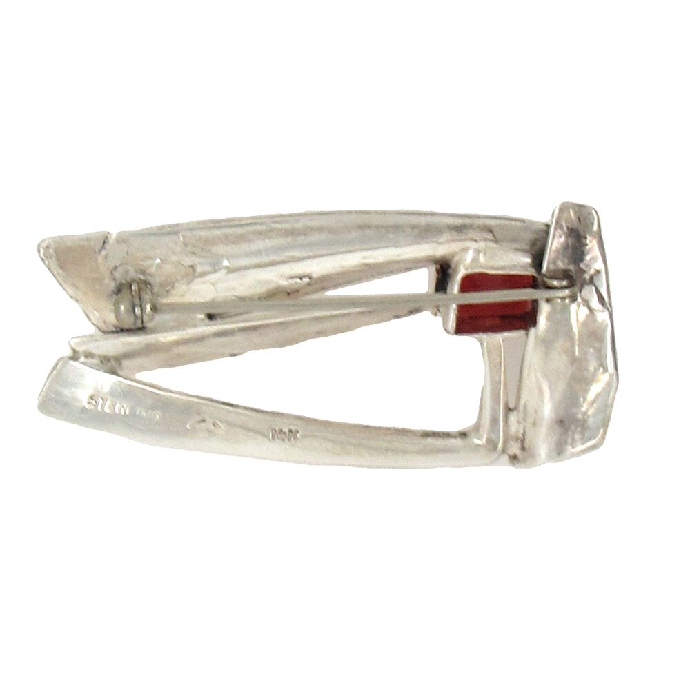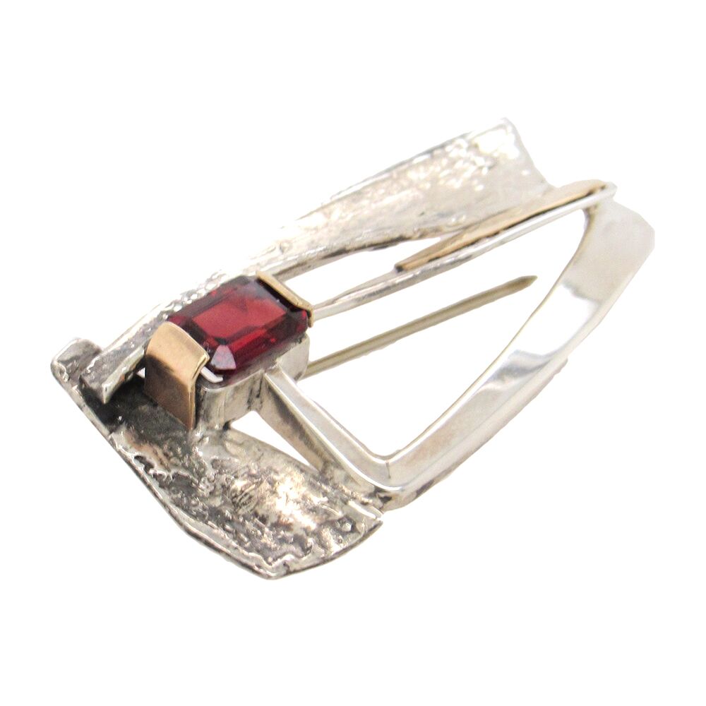 From a private estate, Glenda Arentzen’s textured elongated sculptured pin/brooch set with a rectangular wine red garnet asymmetrically in the openwork brooch, sterling silver and 14K gold. Measures 2″ x 1″.