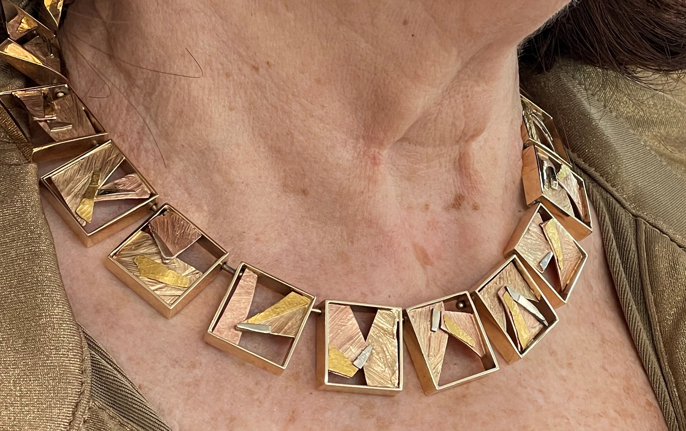 A rare and remarkable opportunity to own artist Glenda Arentzen’s gold ‘Box’ necklace, a museum-quality tour-de-force of painting in precious metal in three-dimensional collage form, circa 1985. Each ‘box’ measures 3/4″ x 3/4″ x 3/16″ deep and is 15″ long. Each collage box is assembled with textured strips of 14K yellow gold, 14K rose gold, 18K white gold and 24K pure gold, framed by 14K yellow polished gold ‘boxes’. The shepherd’s hook clasp 3/4″ in length for safety.