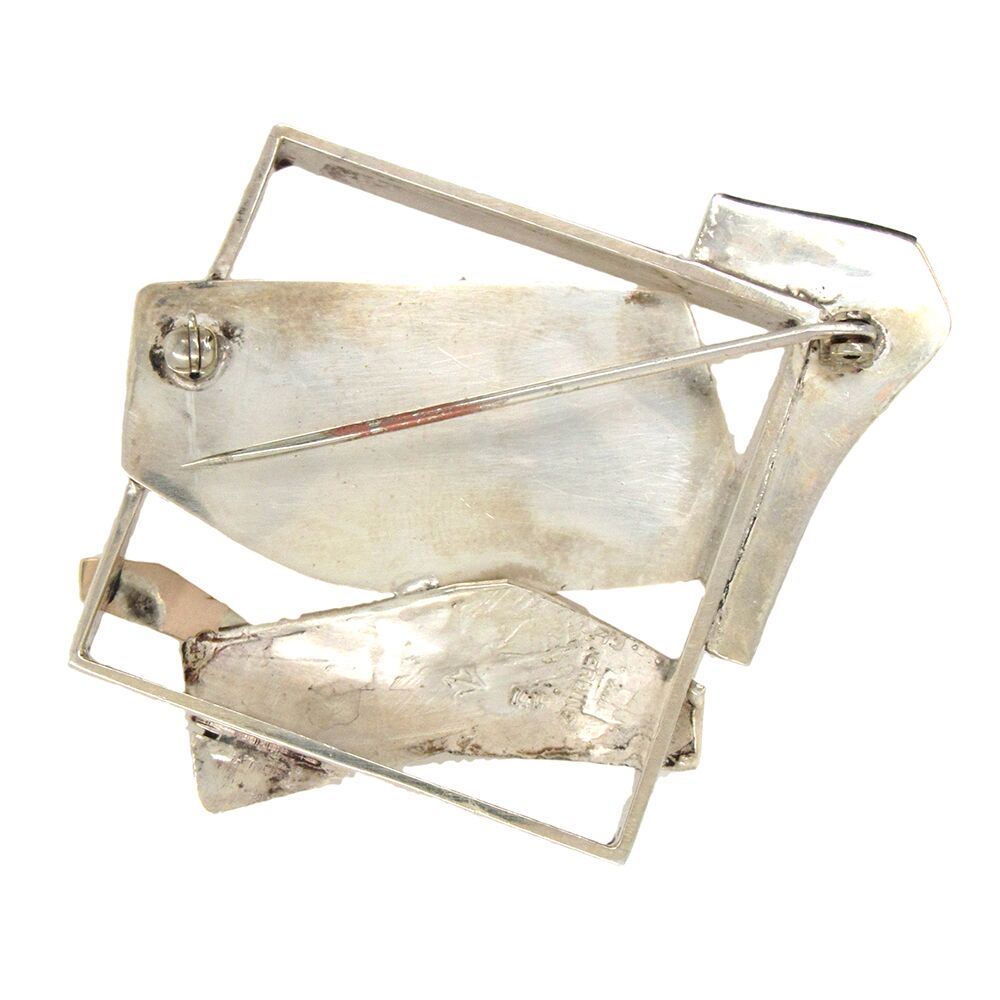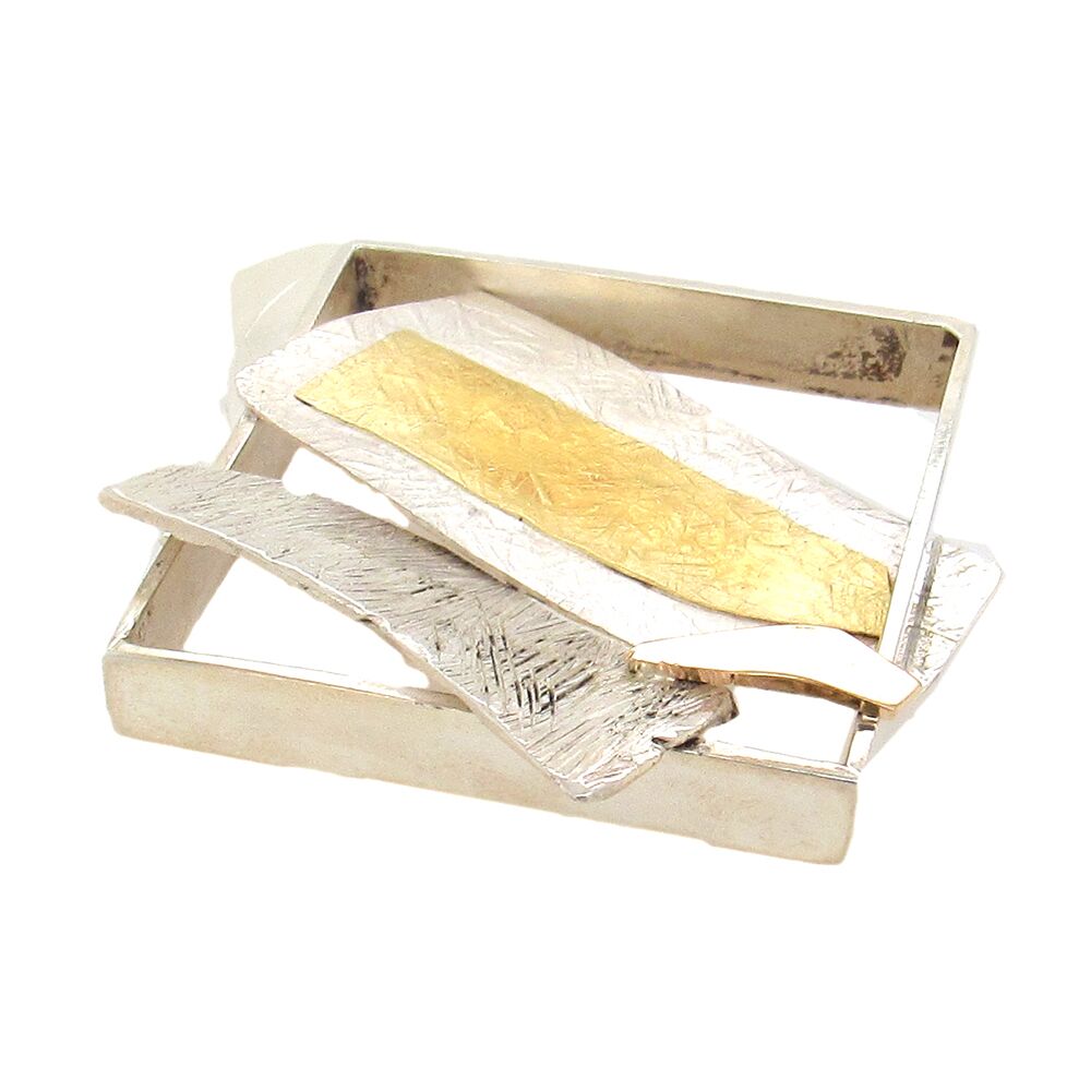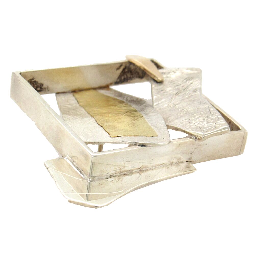 Artist Glenda Arentzen sculpts in miniature, with precious metal: here, a square openwork brooch, the square form ‘broken through’ with sterling, 24K and 14K gold ‘shards’ of precious metal. The pin measures 1-3/4″ x 1-3/4″. From a private estate.