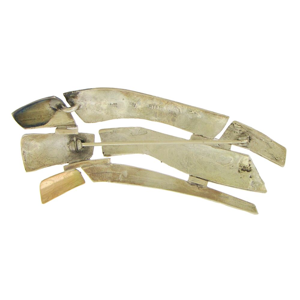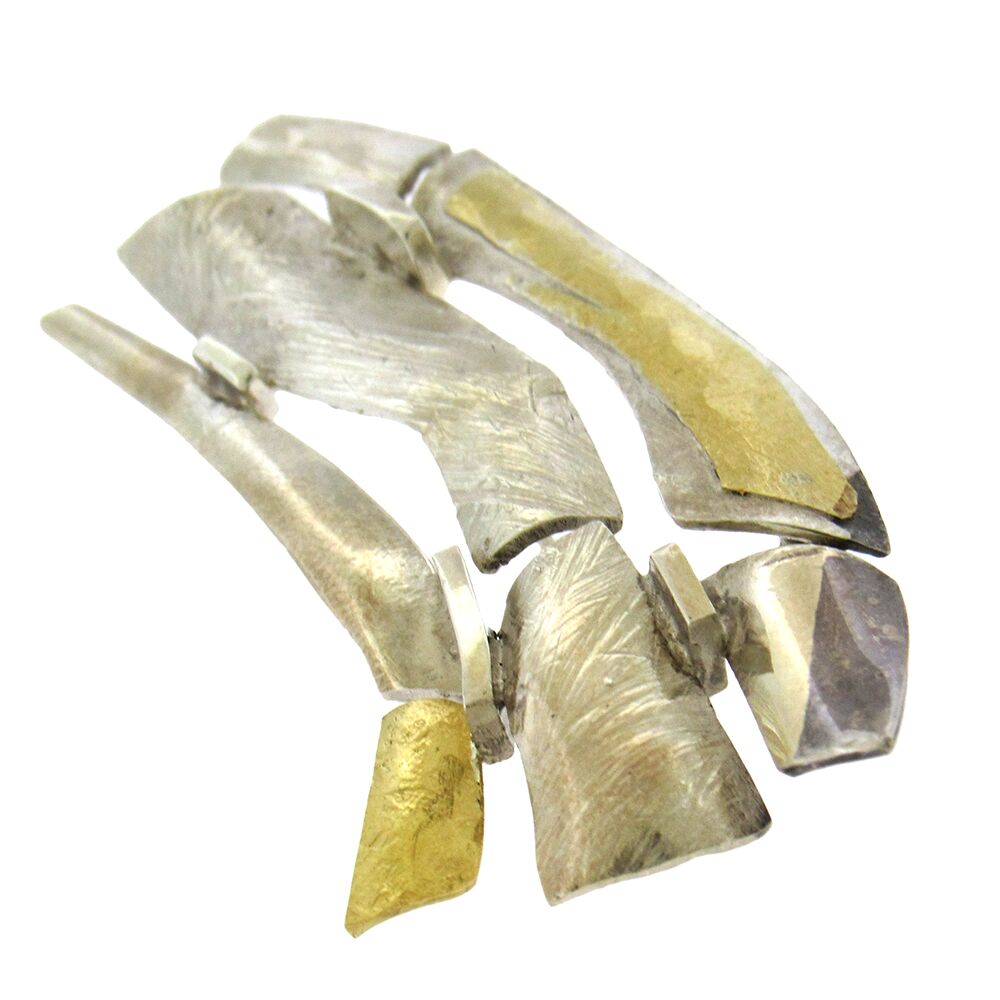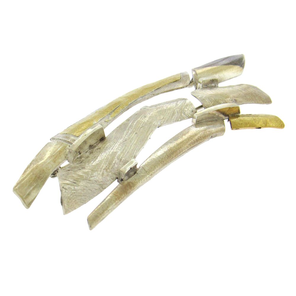 An airy curved and sculptural brooch from Glenda Arentzen uses negative space and matte and polished sterling silver for a sculpted abstract pin, 2″ x 3/4″ x 7/8″, accented with polished 14K gold and matte 24K gold. From a private estate.