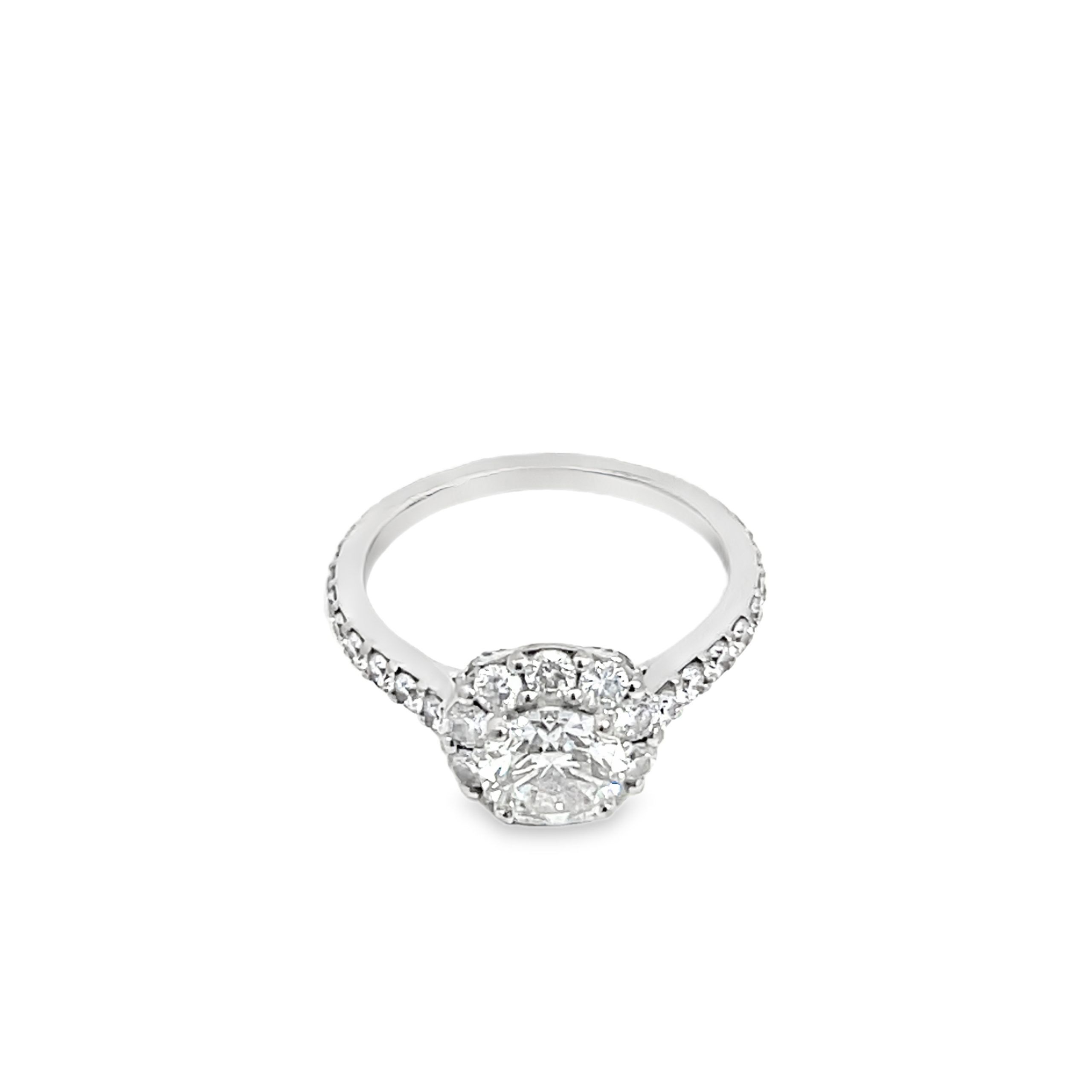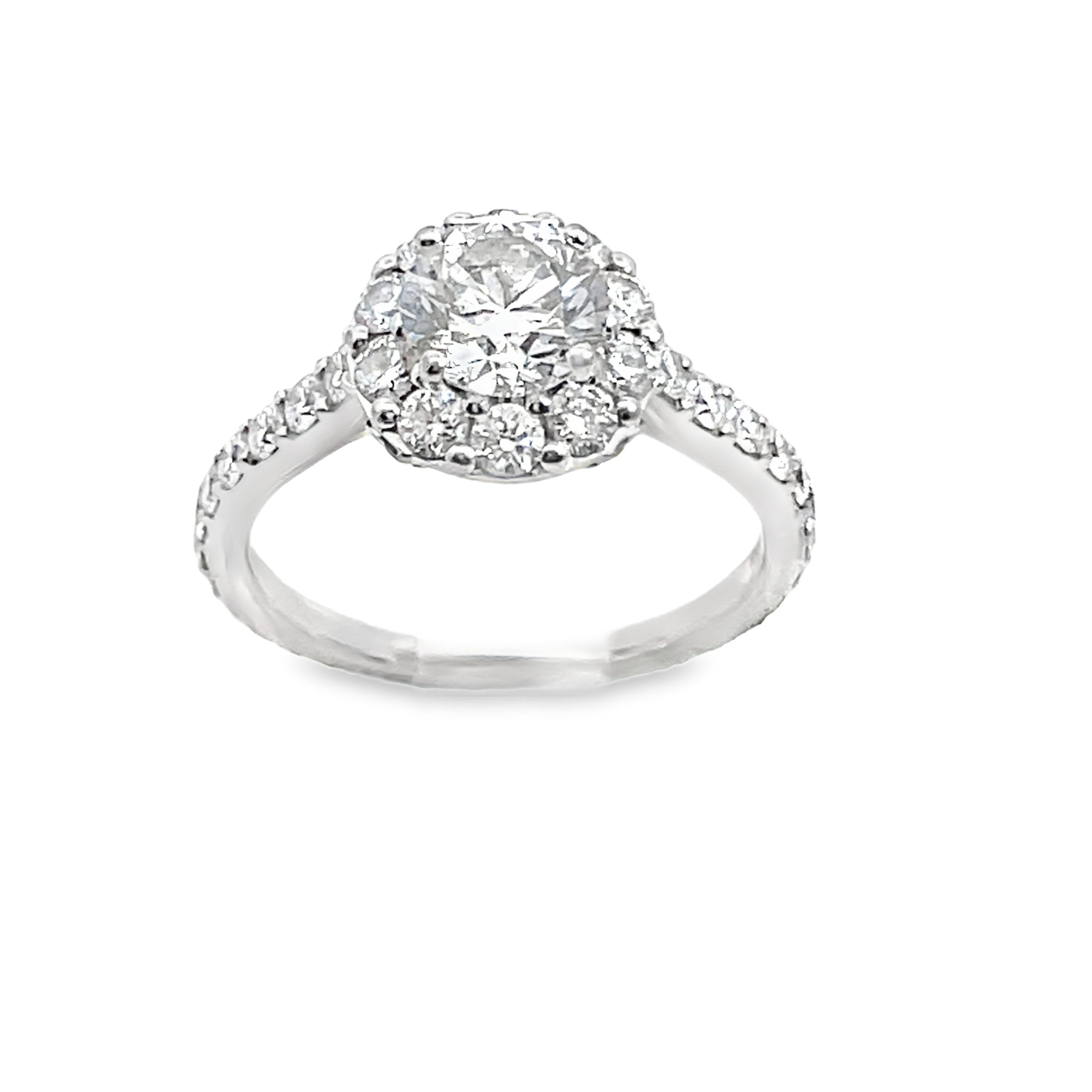 Diamond engagement ring from Graff, previously owned, is set with an 0.83 ct. center round brilliant diamond, graded by Graff G/VS1, set in 18K white gold, with a halo and shank set with 57 diamonds, tw, 1.73 cts. Accompanied by original box, Graff certificate, receipt and paperwork. The ring is currently size 5, and can be sized. *original purchase 2024 $11000