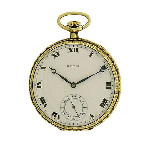 Yellow gold-filled oopen face pocket watch, circa 1915, is a 47mm case with decortive engraving on the front and back bezels, enamel white dial with black Roman numeral hours and outer minute track, subsidiary seconds register with 10-second intervals and blued steel Breguet hands. The 17J manual wind series 7 going barrel movement, by E.Howard & Co Boston, is manually wound, working very well 100 years later, and warrantied by Aaron Faber for a year from purchase.