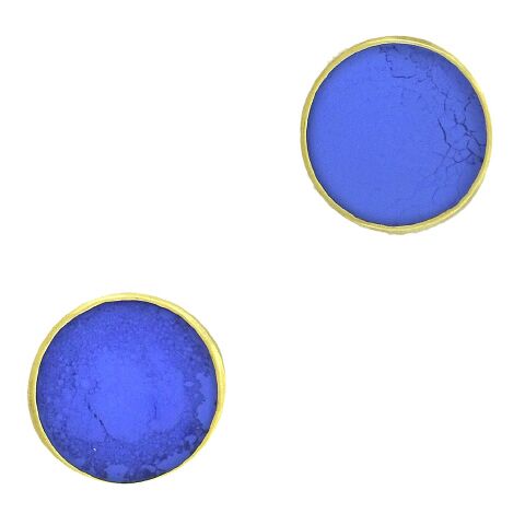 Powedered blue pigment fills thee 5/8″ round earrings, bright blue and fabricated by artist Jennifer Trask in sterling silver, 22K and 18K gold. Posts.