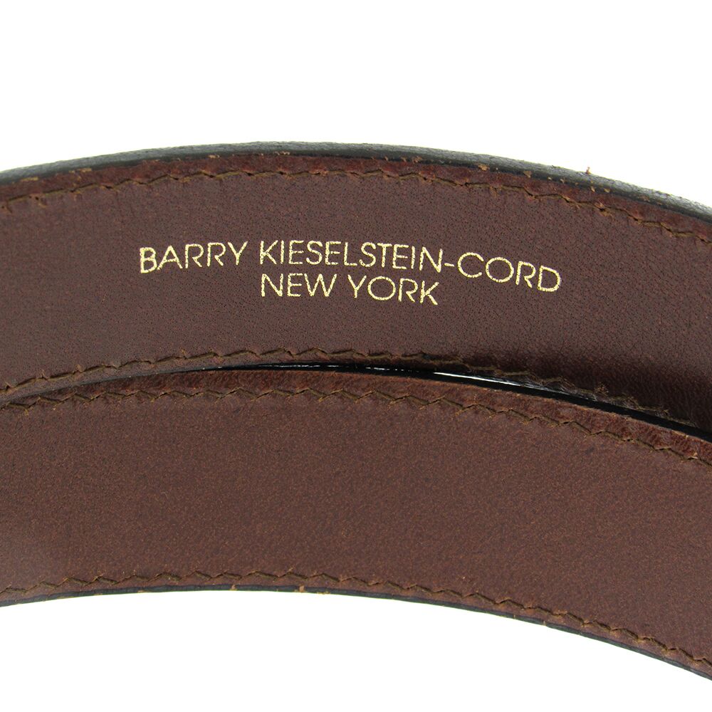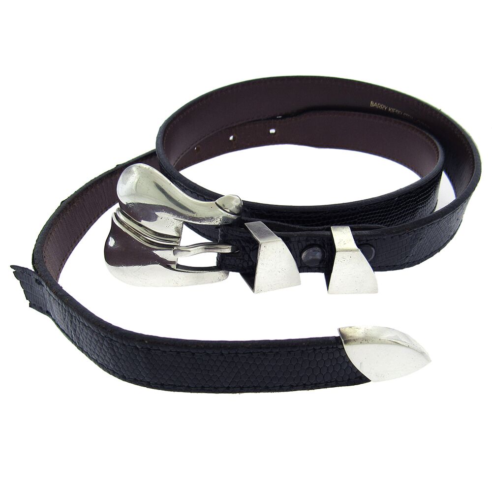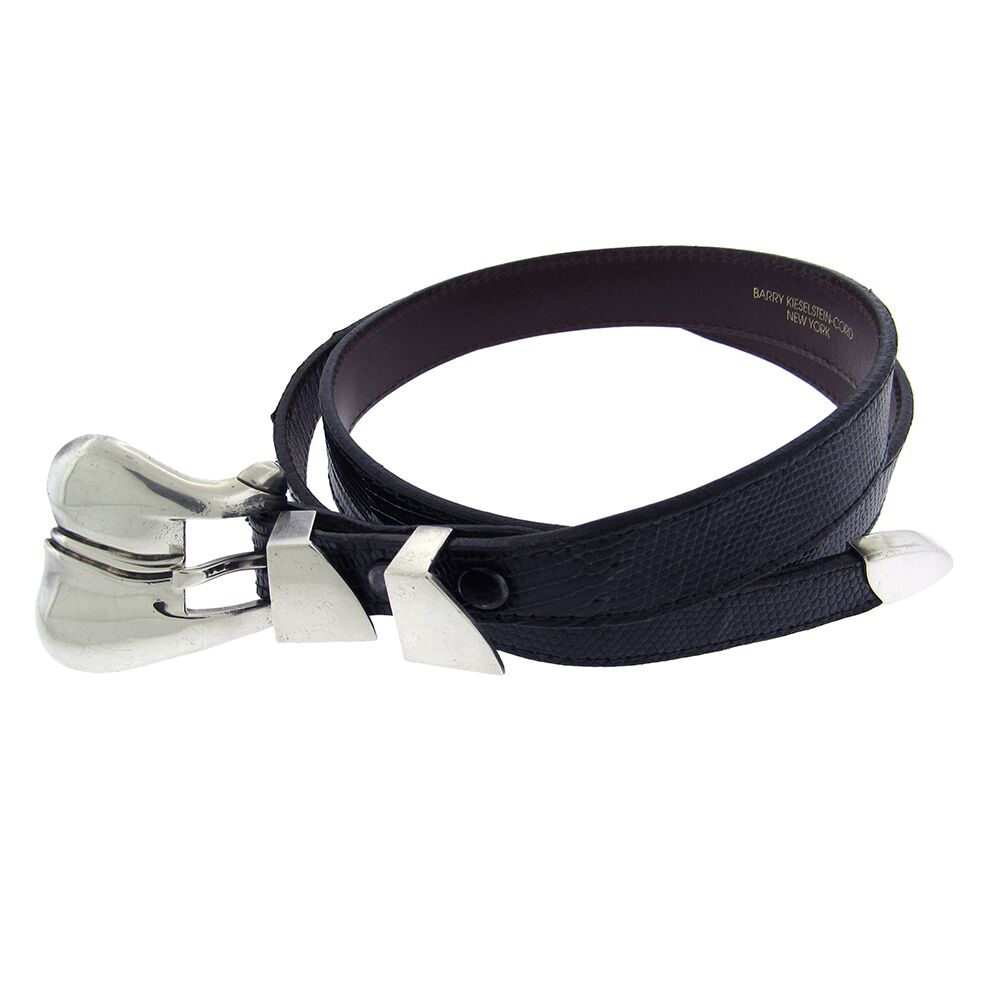 Sterling silver vintage Barry Kieselstein-Cord belt buckle, keepers and tip on this 36″ long black 1″ lizard belt in good condition. The buckle measures 1-3/4″ x 1-3/4″, dated 1976.