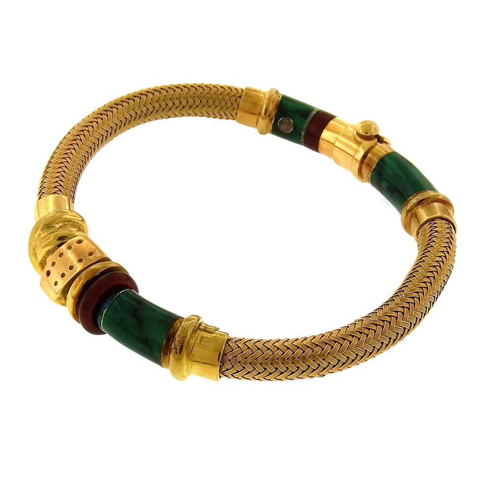 18K yellow gold and enamel La Nouvelle Bague hinged bangle bracelet combines woven gold mesh, 6mm in diameter, with green and burgundy enamel on sterling stations, fits small to mdeium wrists. From a private estate, circa 2000’s.