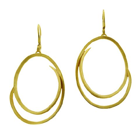 Barbara Heinrich’s references are natural forms and here she creates a modern take on the hoop with an 18K yellow gold open oval, the leaf form wrapped and polished, with an 18K gold earwire at top. Measures 1-1/8″ w x 2″ long.