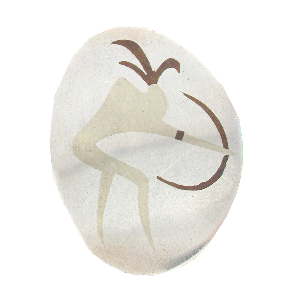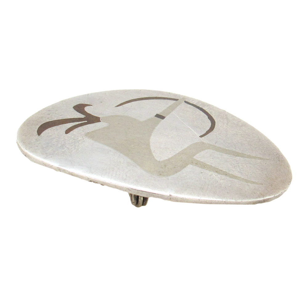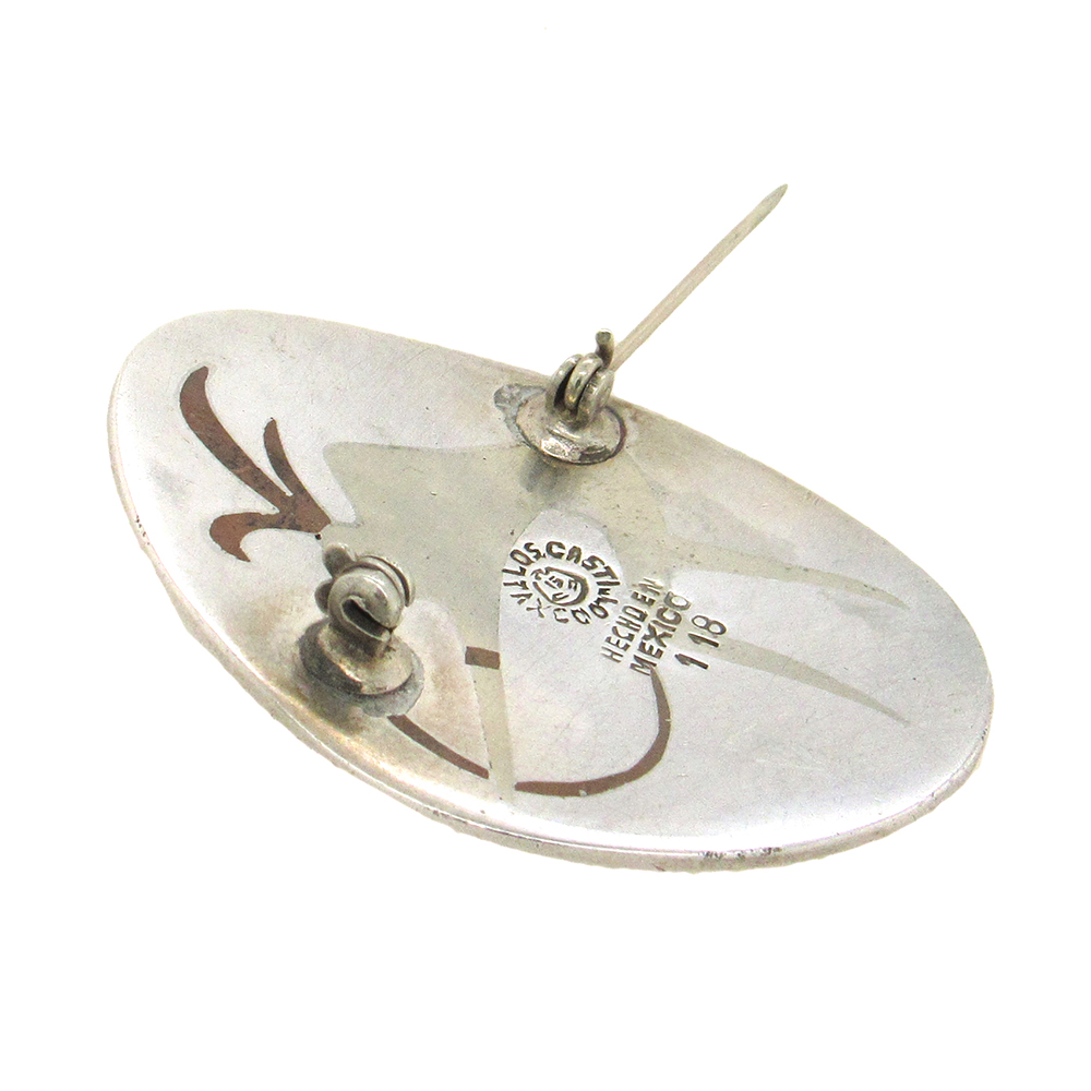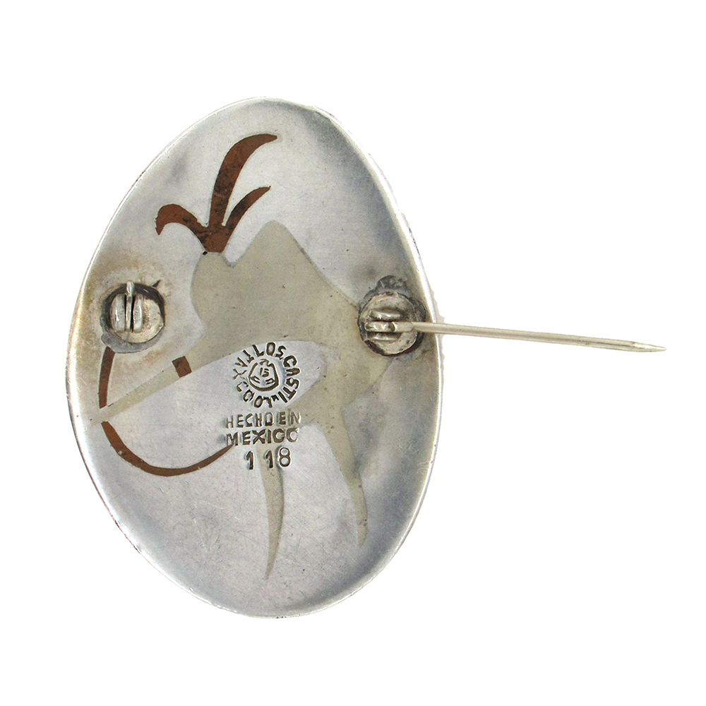 From Los Castillo, Taxco, Mexico, a Modernist inlay brooch in sterling, copper and brass depicting an Aztec warrior with bow and arrow fully drawn. The brooch measures 1-1/4″ x 1-5/8″.