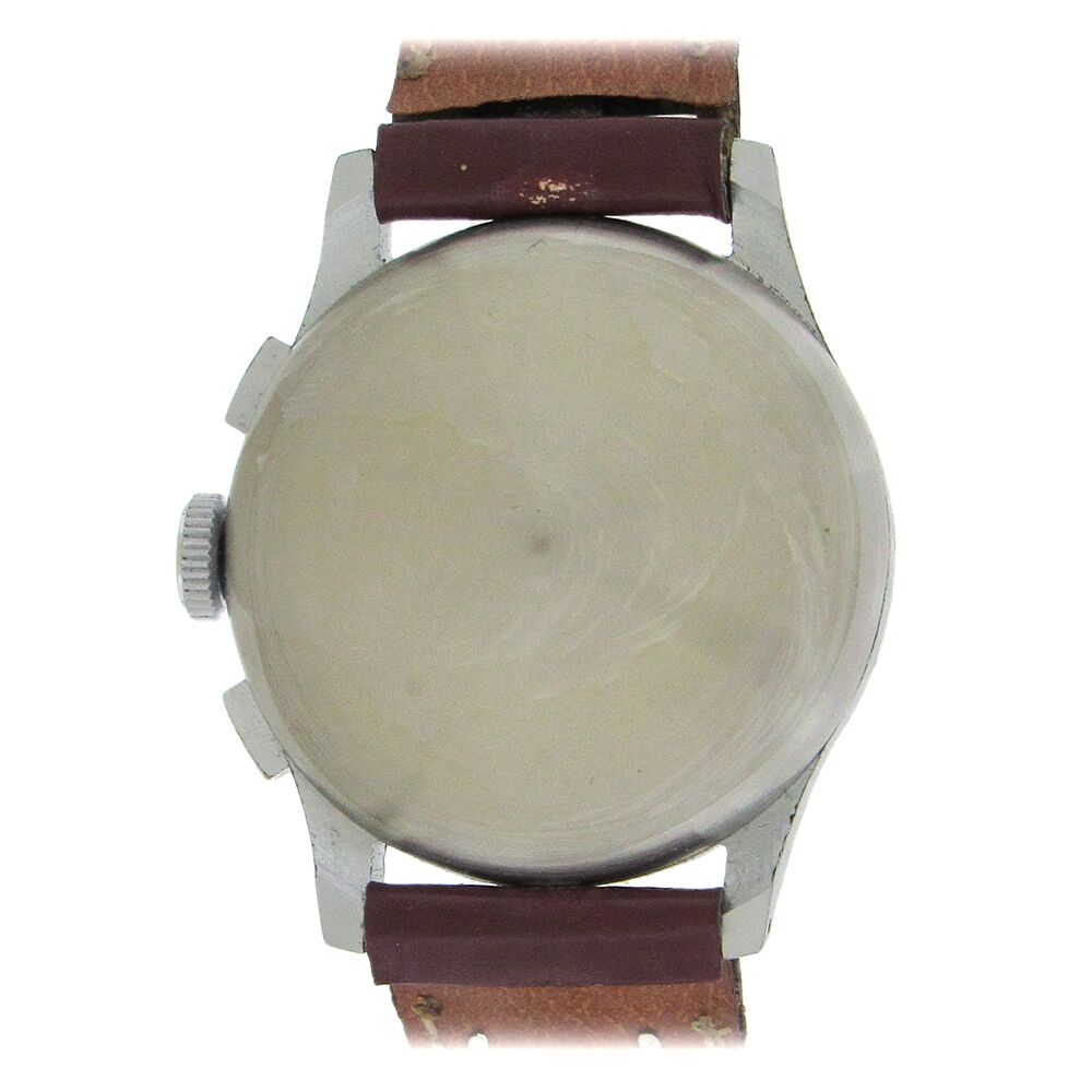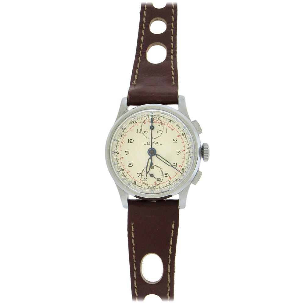 The mid-20th century brought flight and war to the forefront of the world, and during this period, 1940 to 1950, the Swiss watch industry turned out mechanical accurate chronographs for pilots, navigators, officers and the military. Today, these watches are still accurate, but their design is what drives the collectors market. This 33.5mm stainless steel Swiss chronograph, brand Loyal in excellent condition,  has a snap back with square-button chronograph, register, telemeter and tachometer scales in red and blue. The silver dial features painted Arabic hours, outer minutes and fifths of a second track concentric with red 0-20 telemetric scale, outermost blue 1000-60 km/h tachometer scale, subsidiary dials for the seconds and 30-minute register, and black silhouette hands.The 17 jewels Venus manual wind movement is warrantied by Aaron Faber for 12 months.