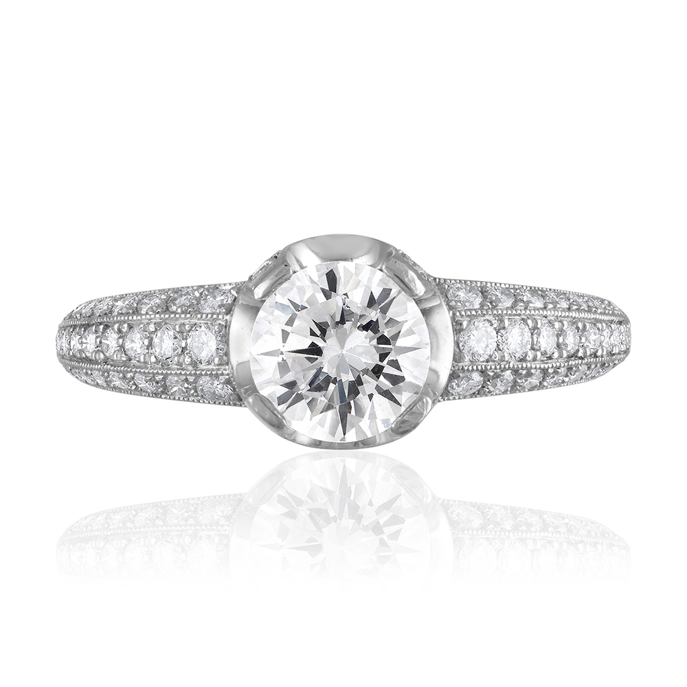 English designer Lucie Campbell has an affinity for platinum filigree mountings and this is one of the most romantic in her collection, curved mounting entirely set on three sides with diamonds, including the basket that will hold the diamond, designed for a 1.25 -1.75 carat gem.