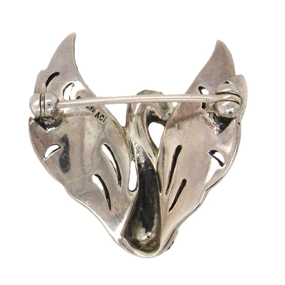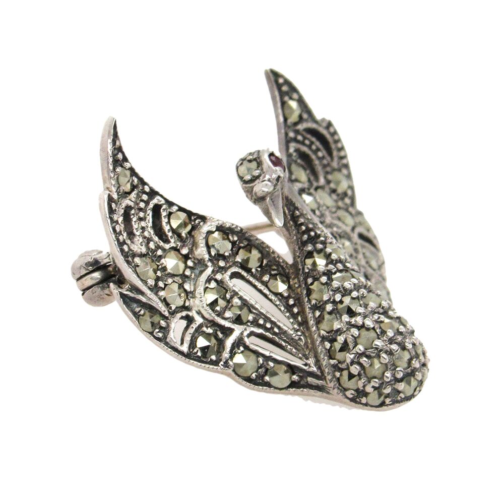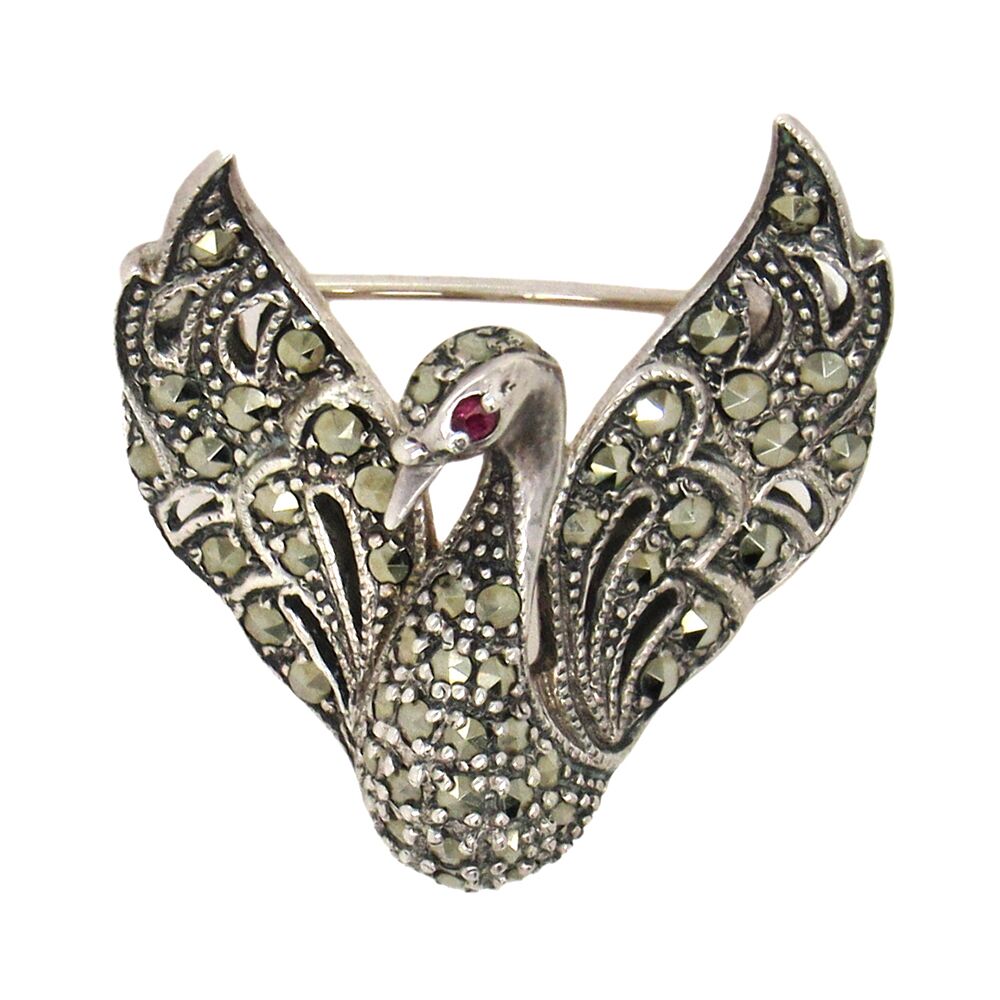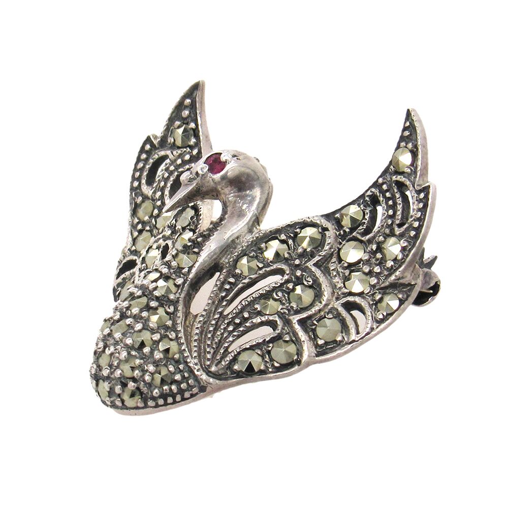 Charming vintage sterling silver and marcasite swan pin measures 1-1/8″ x 1-1/8″, with unfurled wings.