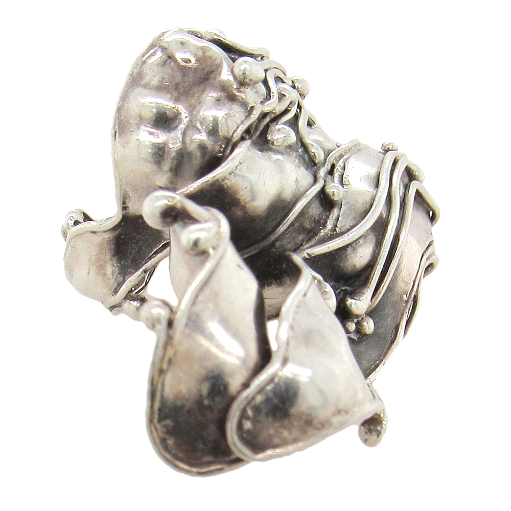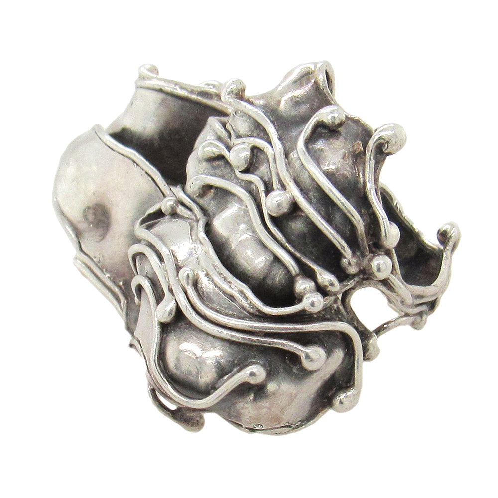 From a well-known collector’s estate, a two-finger repoussed sterling ring by Marci Zelmanoff, made in the early 1970’s. The ring measures 2″ x 1-1/4″ at the widest and is size 6. Zelmanoff was a jewelry artist well ahead of her time. Her feminist, bold, sometimes feverish constructions appealed to women wearers, but were generally ignored by the burgeoning art jewelry institutions and media. Today her work is recognized for its originality and singular vision.