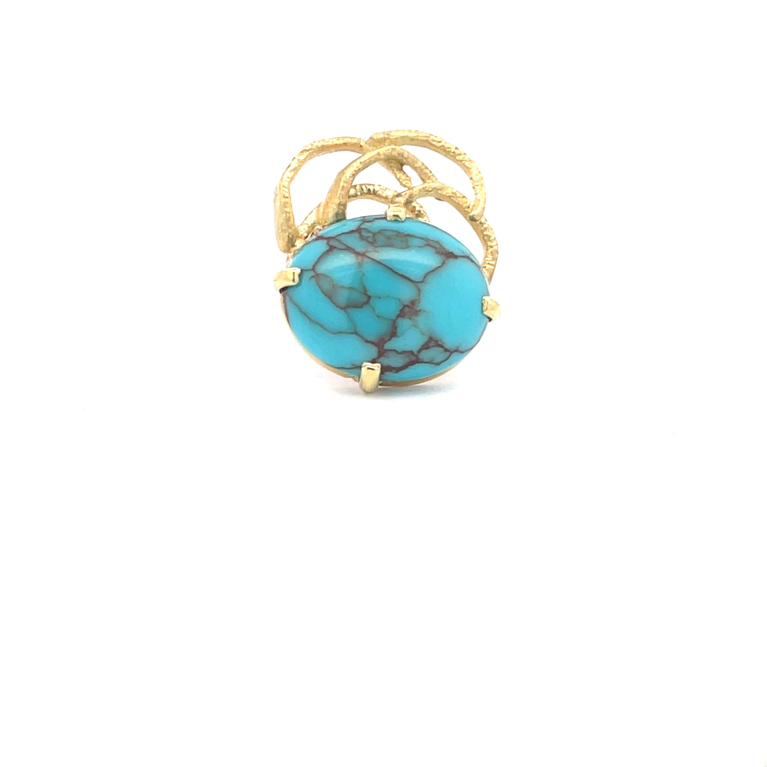 Marco Borghesi’s turquoise and 18K gold ring sets an oval cabochon blue turquoise with its spiderweb black matrix patterning in his looped, airy cocktail ring. Measures 1″ x 1″, and is an adjustable size 6.5.
