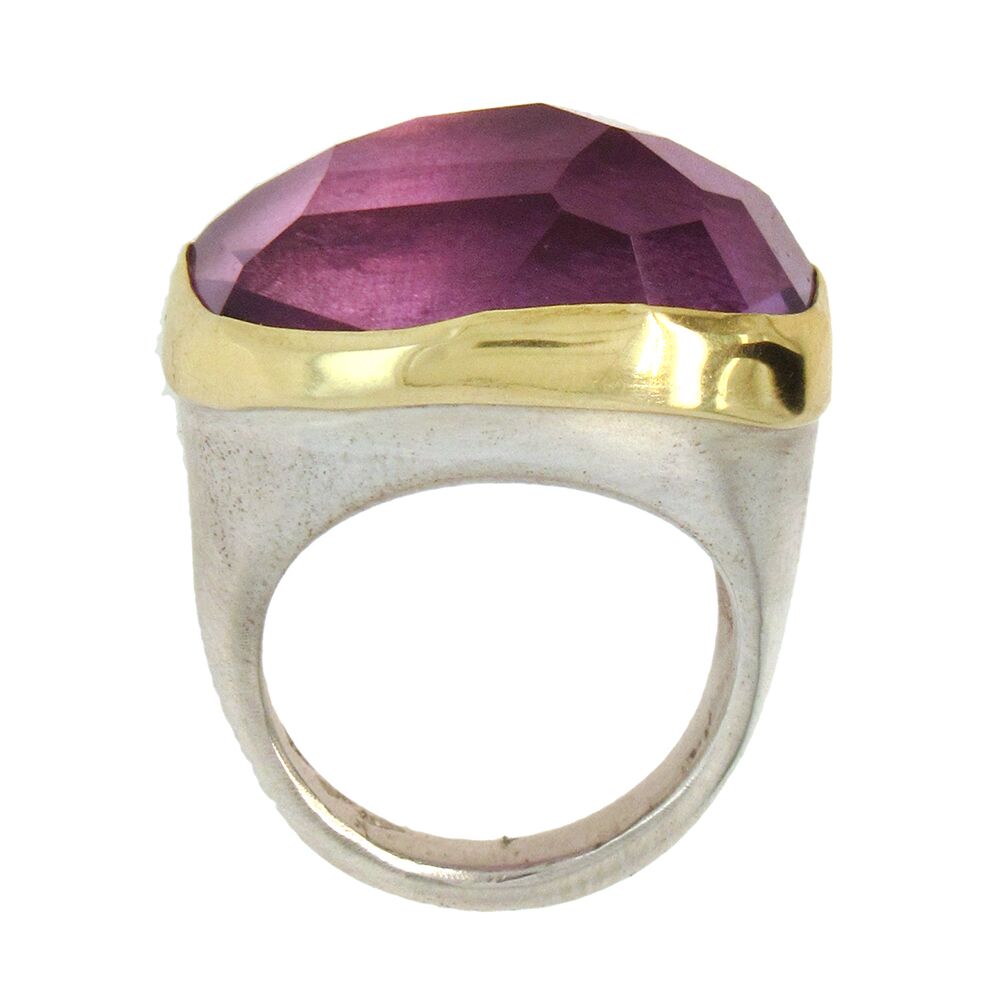 Fit for a Royal, a 31 carat rose-cut amethyst is set in 18K gold bezel, sterling silver mounting, from Margoni Studio. The ring measures 1″ x 3/4″ x 3/8″.