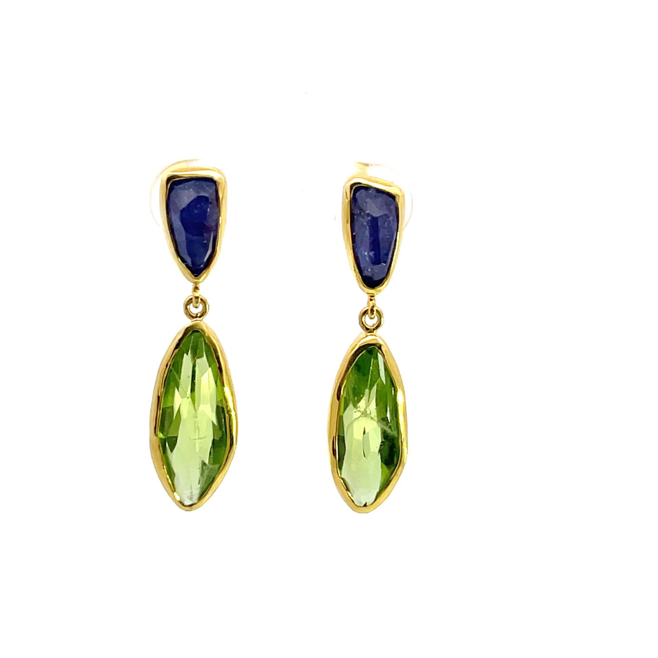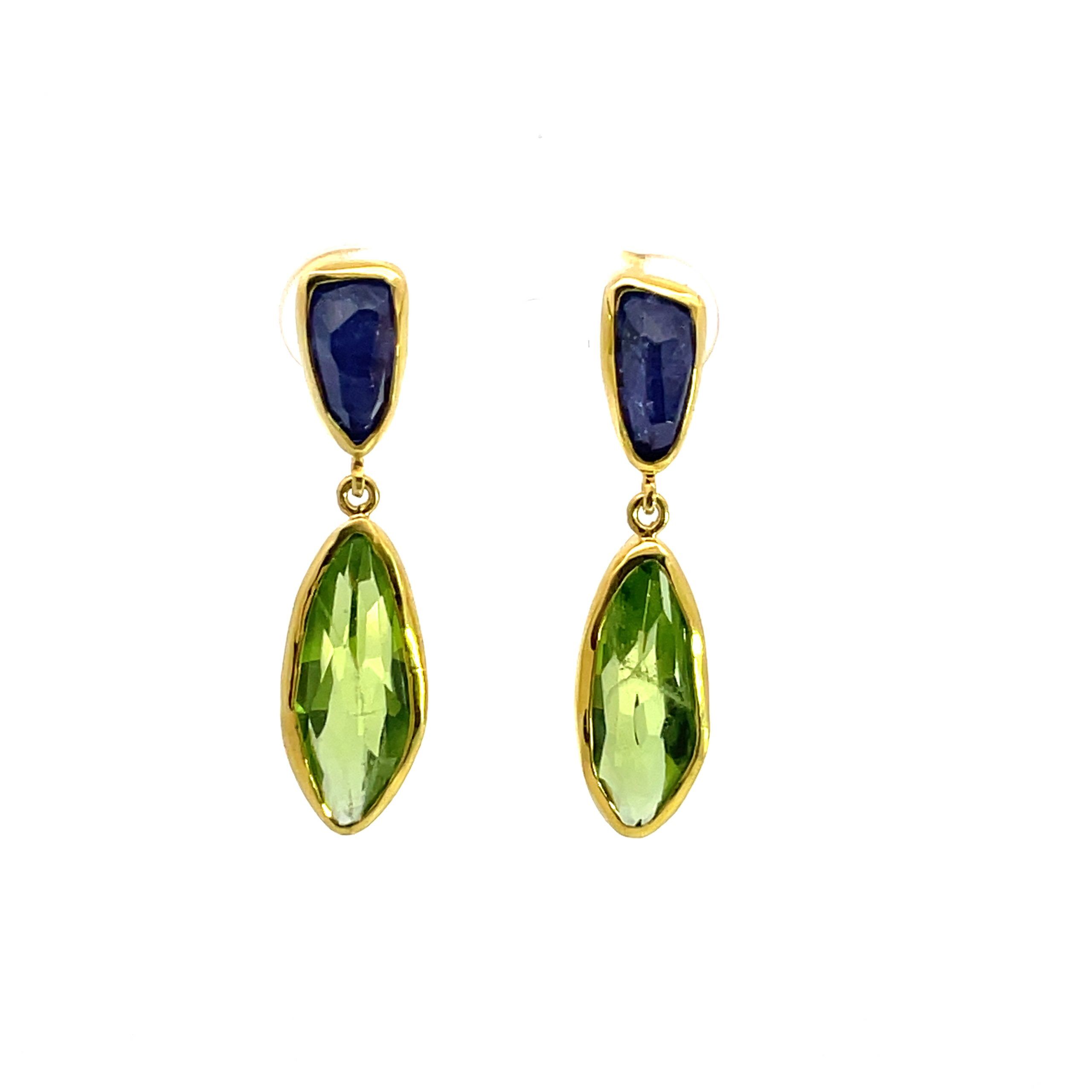 Tanzanite blue and peridot green light up these rose-cut gem drop earrings by Margoni, 13 carats TW, set in 18K gold. The earrings measure 1/4″ at the widest and 1-1/8″ long, 18K gold posts.