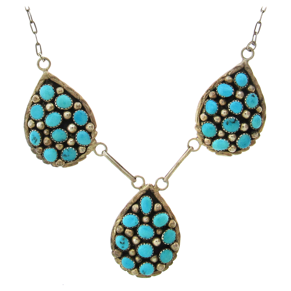 Bright and colorful, Marie Thompson’s three teardrop necklace is set with turquoise cabochons in each of the carefully wrought convex pendants. Each pendant measures 1-1/8″ at the widest x 1-5/8″. The chain length to fit is 20″, overall length is 22″.