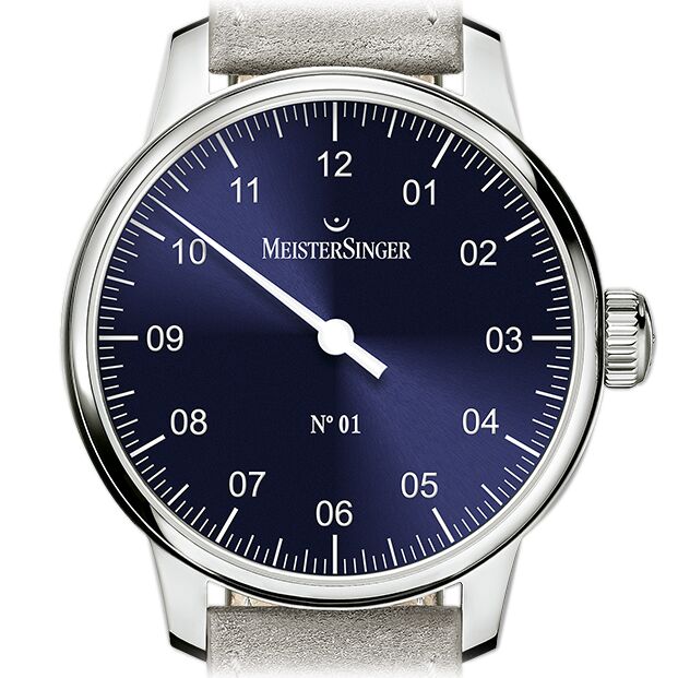 Meistersinger’s No1 mechanical wristwatch has a 43mm heavy duty stainless steel case with rounded stepped bezel, decoratively embossed screwdown back with signature fermata, metallic blue dial with luminous white Arabic hours, white single hand. The watch is manual wind, powered by an ETA 2801 movement, warrantied by the manufacturer for two years, complete with box and papers.