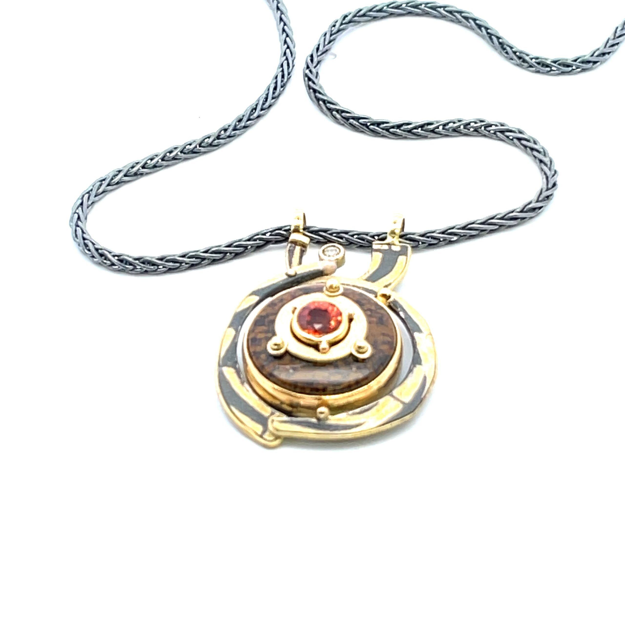 Mixed metal pendant by Michael Boyd set with fossilized dinobone and, at center, an 0.80 carat orange sapphire, on an oxidized 18″ foxtail chain. The pendant is 7/8″ x 1-1/4″, set with diamond and fabricated by the artist with sterling silver, 18K gold, 22K gold and 24K gold, signed and inscribed on the back..