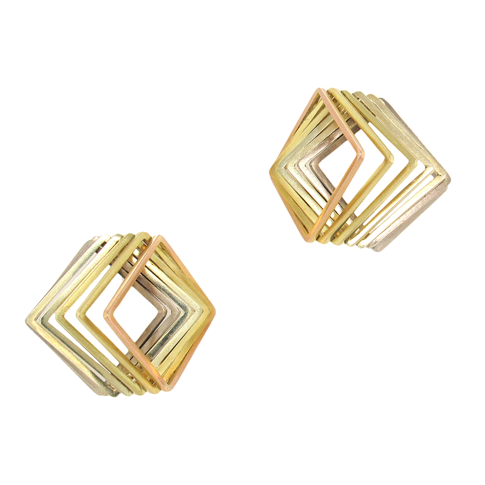 Momoko Kumai’s cascading open cube earrings in 18K yellow white and green golds, with their tromple l’oeil effect, measure 7/8″ x 3/4″.