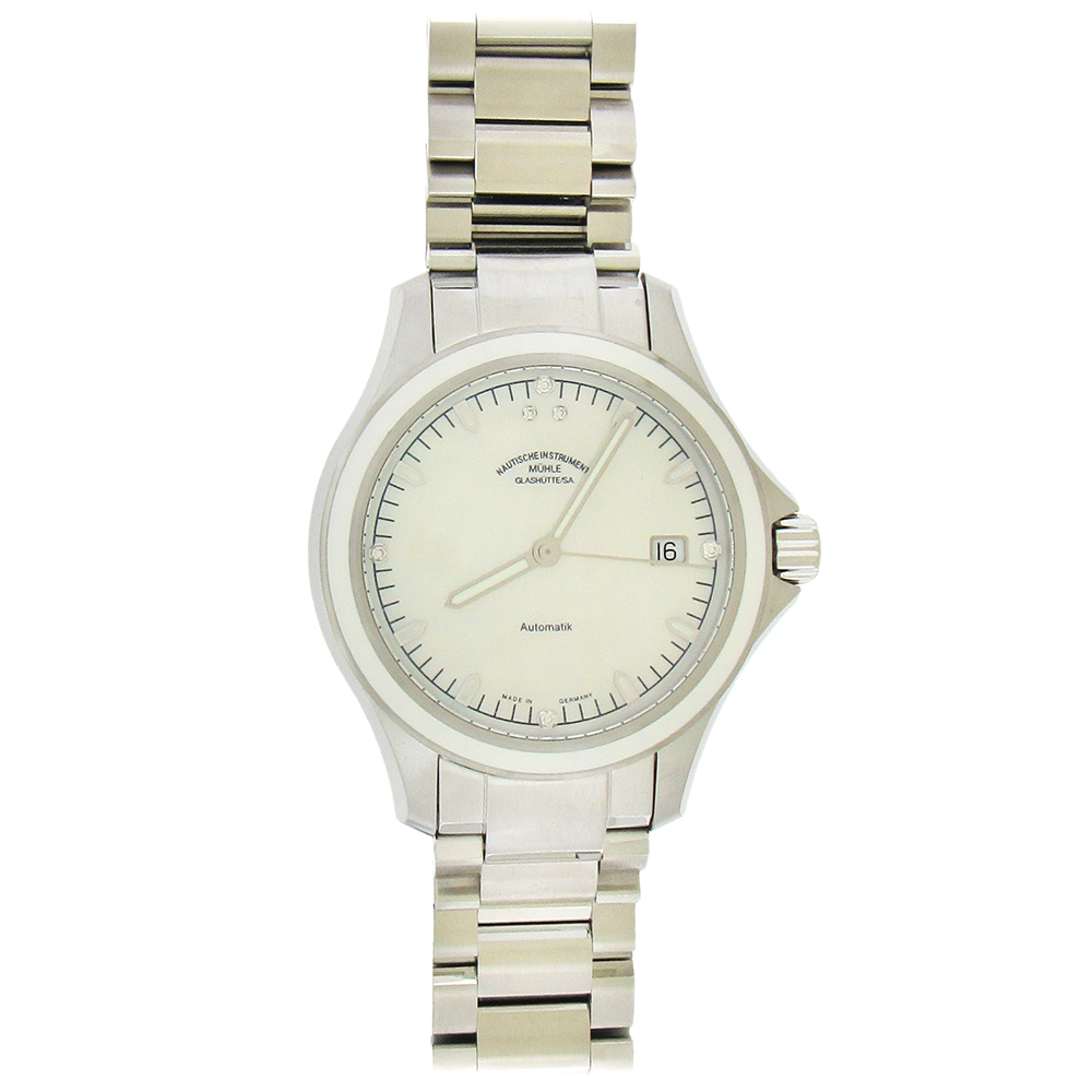 Stainless steel Muhle Glashutte ProMare Lady automatic sports watch is a 42mm round center second wristwatch with a white enamel bezel, see-through sapphire back, 30 meter water resistance, mother-of-pearl dial with diamond quarter hour markers and date at 3 o’clock. The automatic movement is warrantied by Muhle for two years.