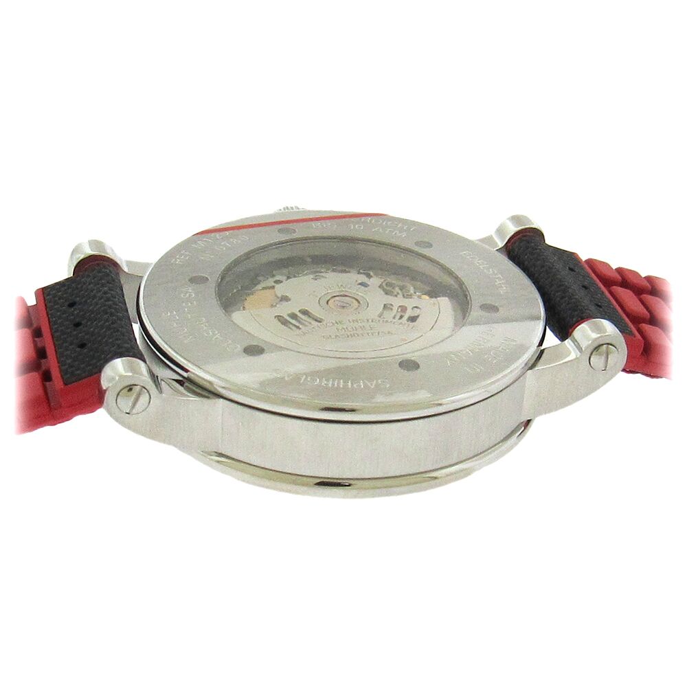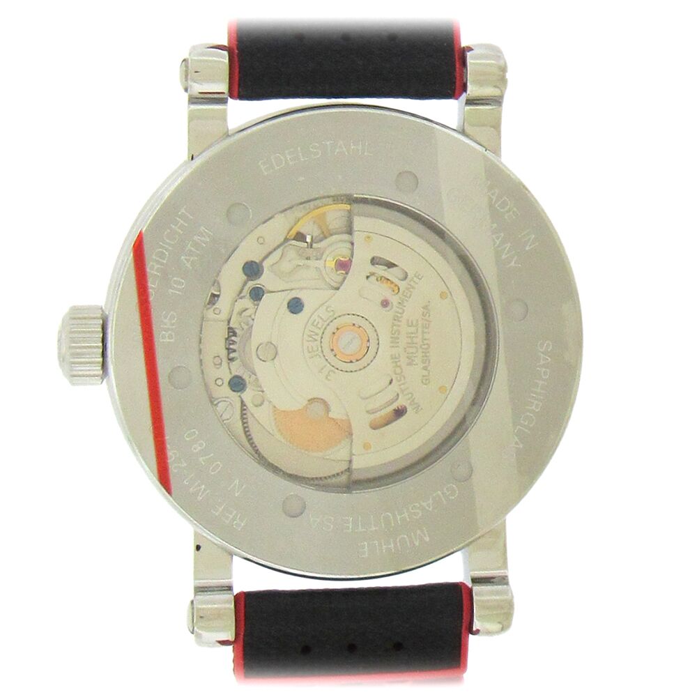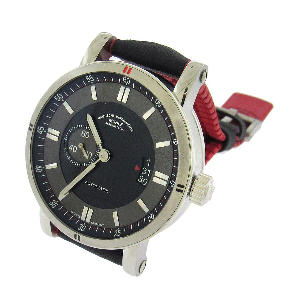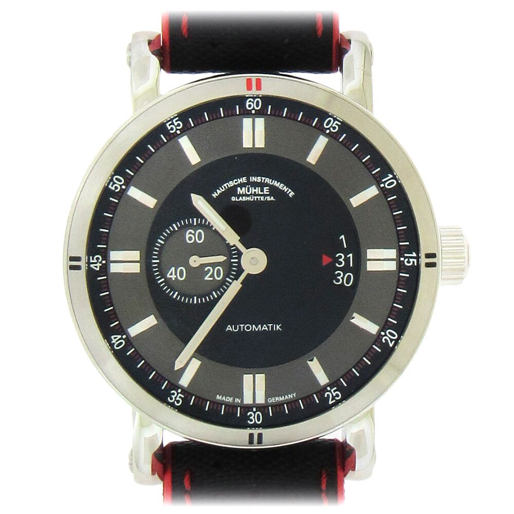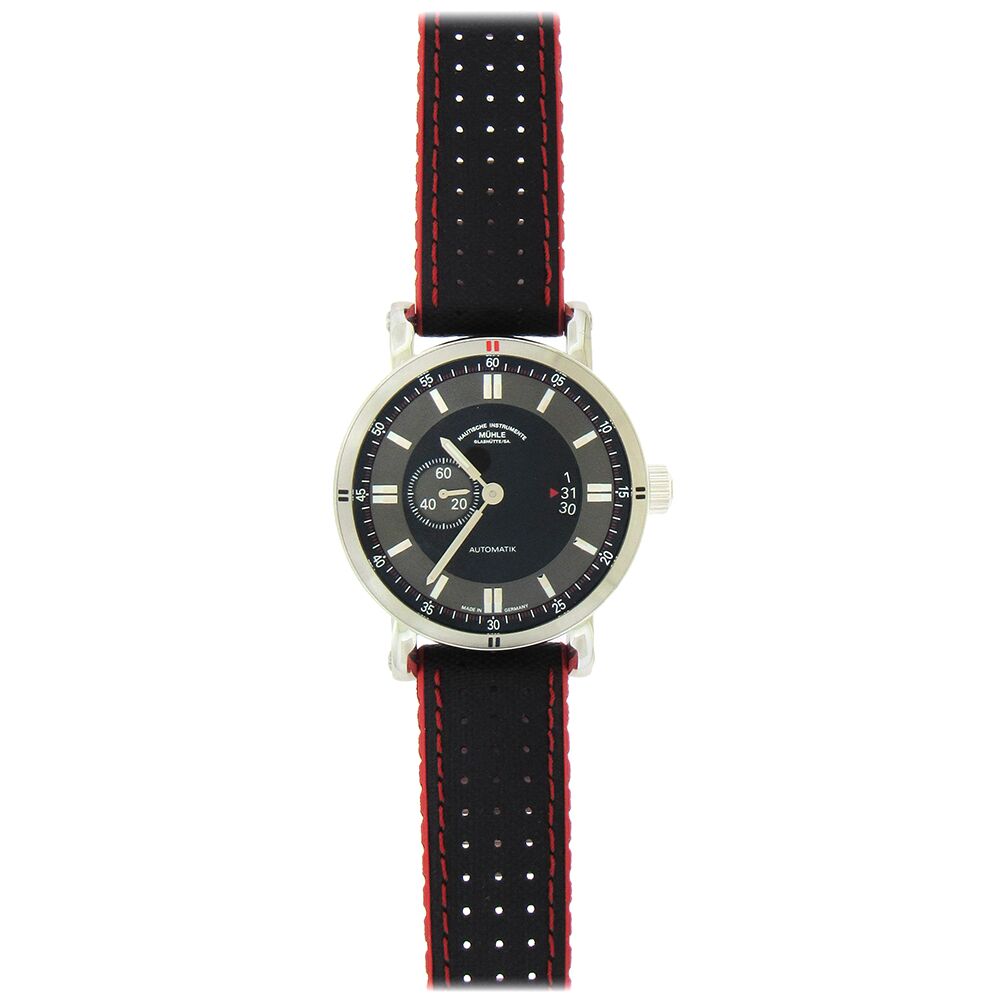 Stainless steel Muhle Teutonia Sport II is a 41mm sport watch with date, see-through screw-down back water-resistant to 100 meters, screw-down crown. The black dial features luminous hour markers, outer minutes/seconds markers, date wheel at 3, seconds register at 9, black rubber strap with red stitching. Accompanied by original, box, papers and 2 year warranty