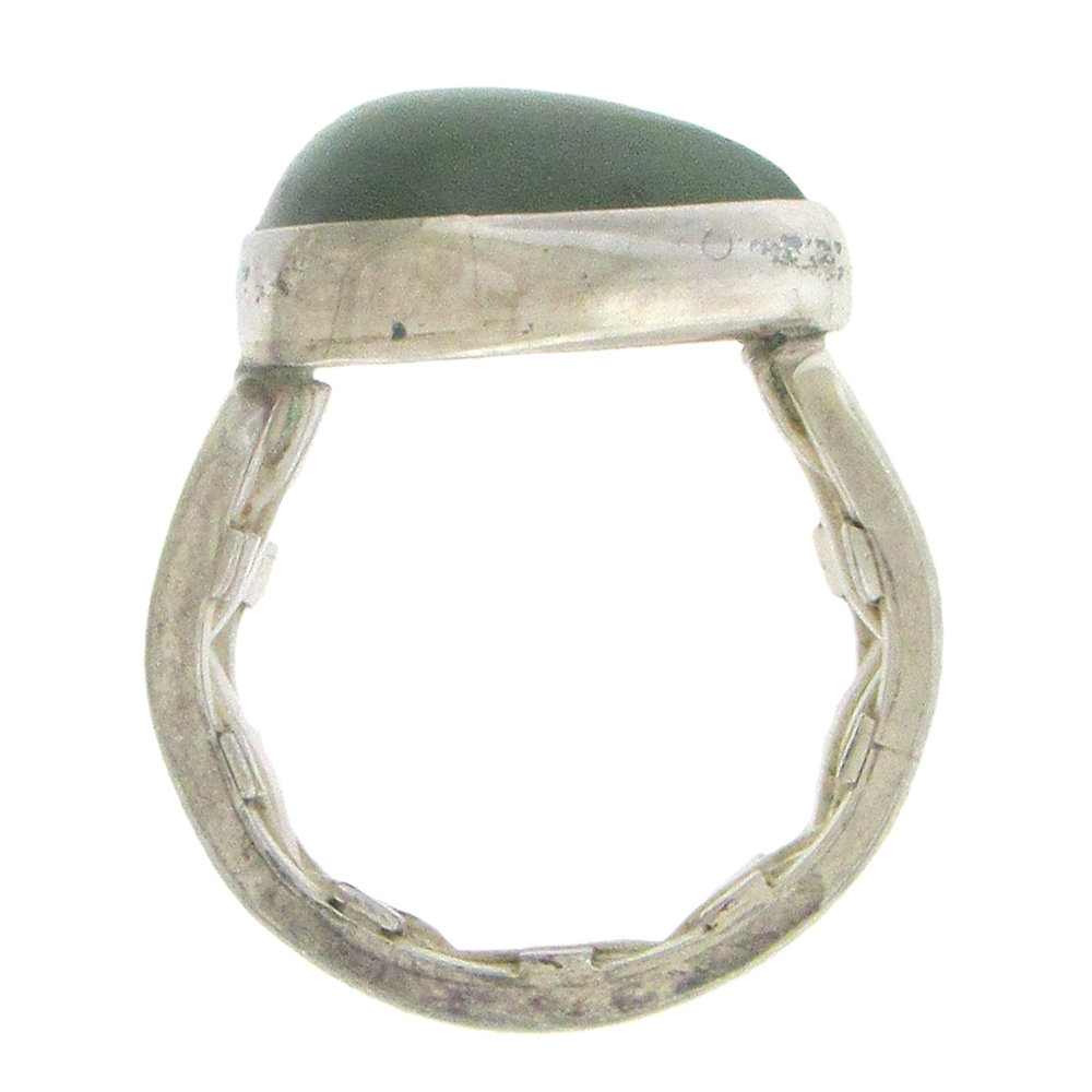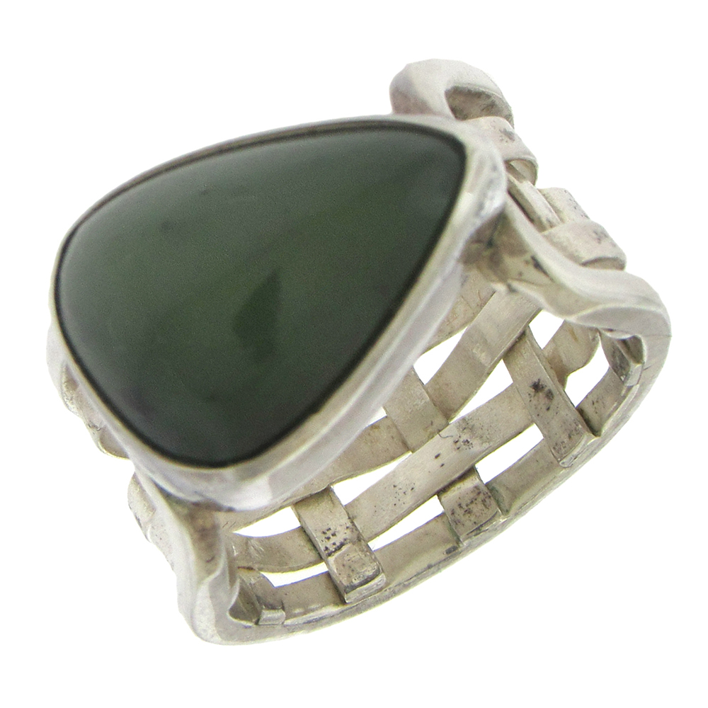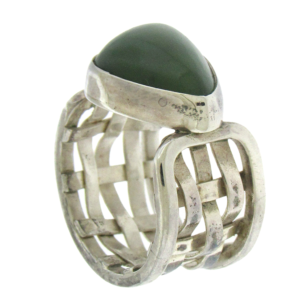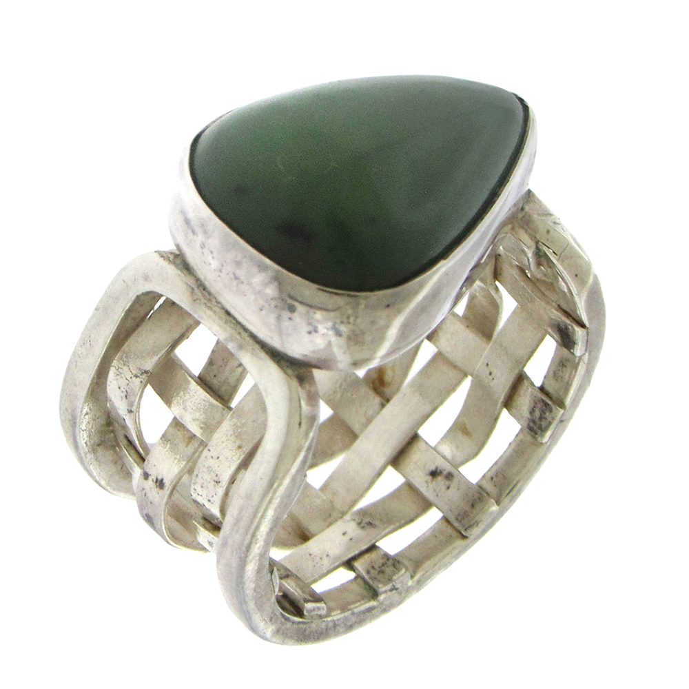 Sterling silver and nephrite jade ring, circa 1970’s, is set in a hand fabricated 1/2″ wide woven shank. The pear-shape cabochon ring measures 3/4″ across.