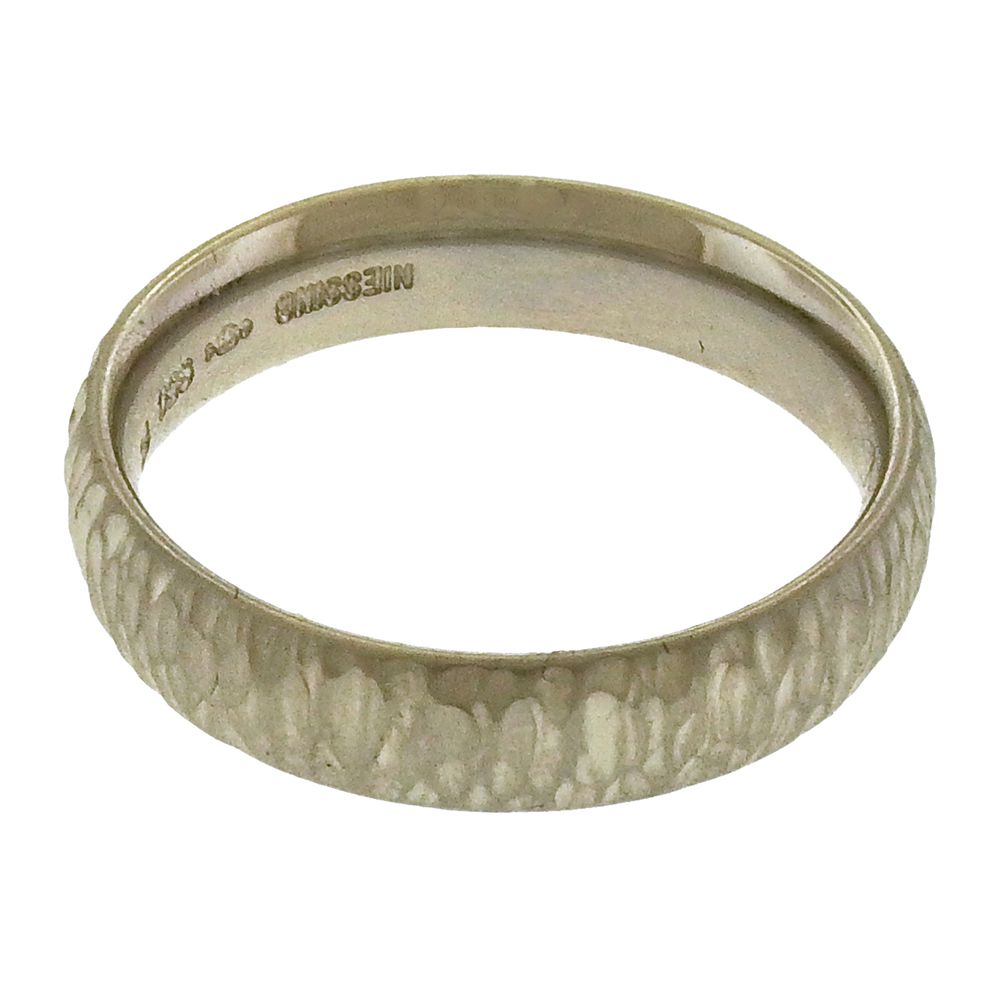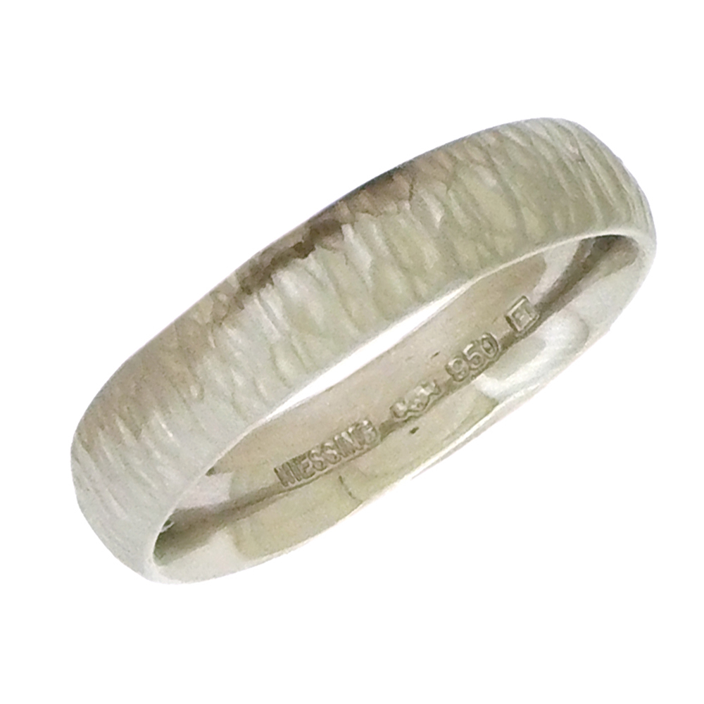Niessing’s ‘Hammerblow’ series creates handmade texture on precious metal rings, here the men’s 18K yellow gold 6mm band with matte textured diagaonal finish. Available in most widths and precious metals.