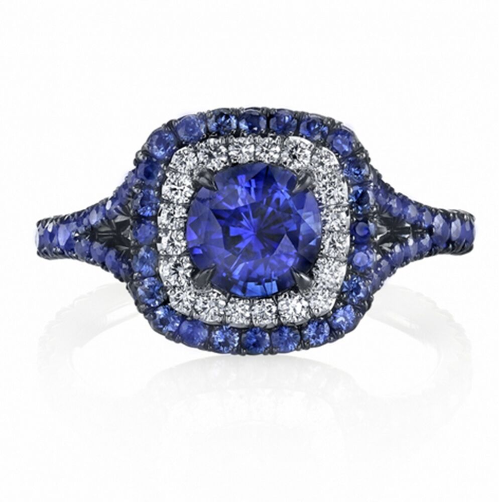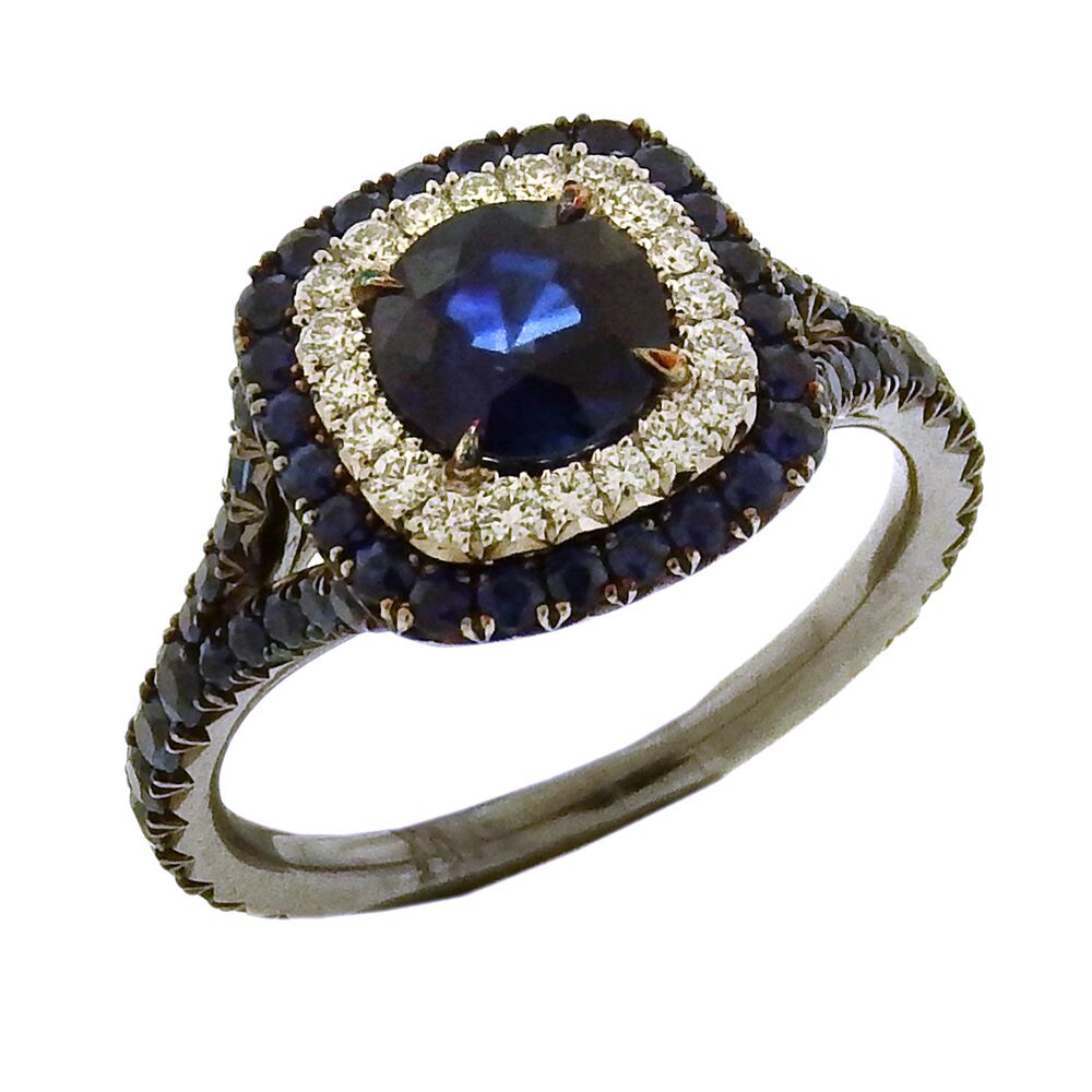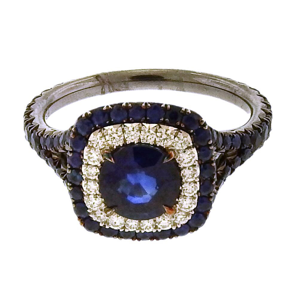 Stunning blue sapphire and diamond cushion-form ring from Omi Prive sets a 1.06 carat round sapphire in a diamond, 0.15 cts, and sapphire melee, 0.97 cts tw, frame dramatized by a black rhodium finish. Ring measures 3/8″ square.