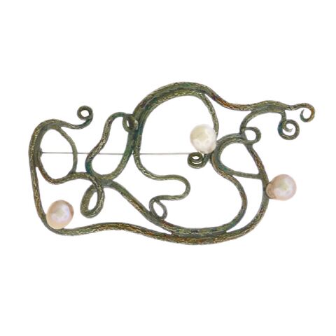 So Young Park’s openwork oxidized sterling silver brooch with three pear-shape pink pearls is forged by the artist, in an Art Nouveau style — though thoroughly modern — with the whiplash lines of sterling silver tapering to curlicues. The pin measures 3-1/4″ x 1-3/4″.