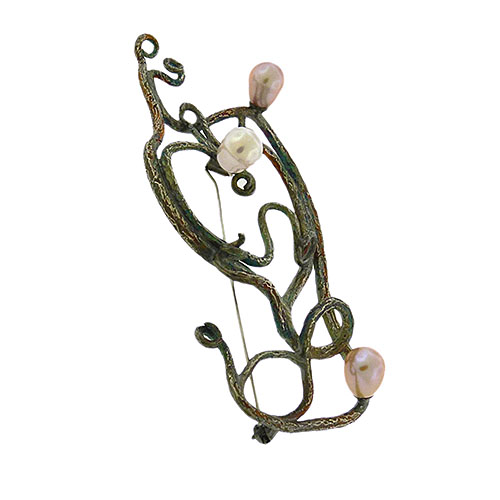 So Young Park’s openwork oxidized sterling silver brooch with three pear-shape pink pearls is forged by the artist, in an Art Nouveau style — though thoroughly modern — with the whiplash lines of sterling silver tapering to curlicues. The pin measures 3-1/4″ x 1-3/4″.