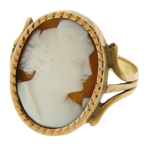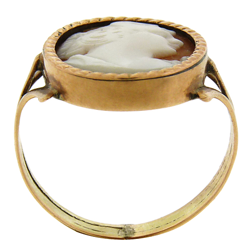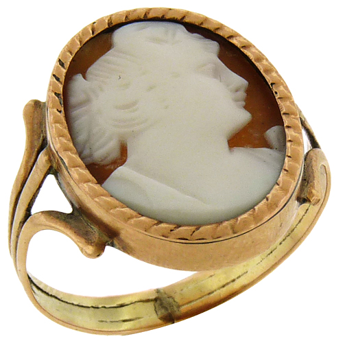 Antique shell cameo ring in rose gold, circa 1900, shows a pedestal-mounted twisted rope bezel, set with a cameo, evocative of the classic fashion styling of the late 19th and early 20th centuries, so well captured in PBS’s ‘Downton Abbey’.