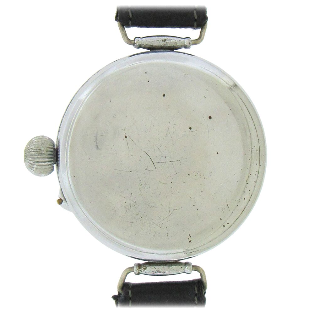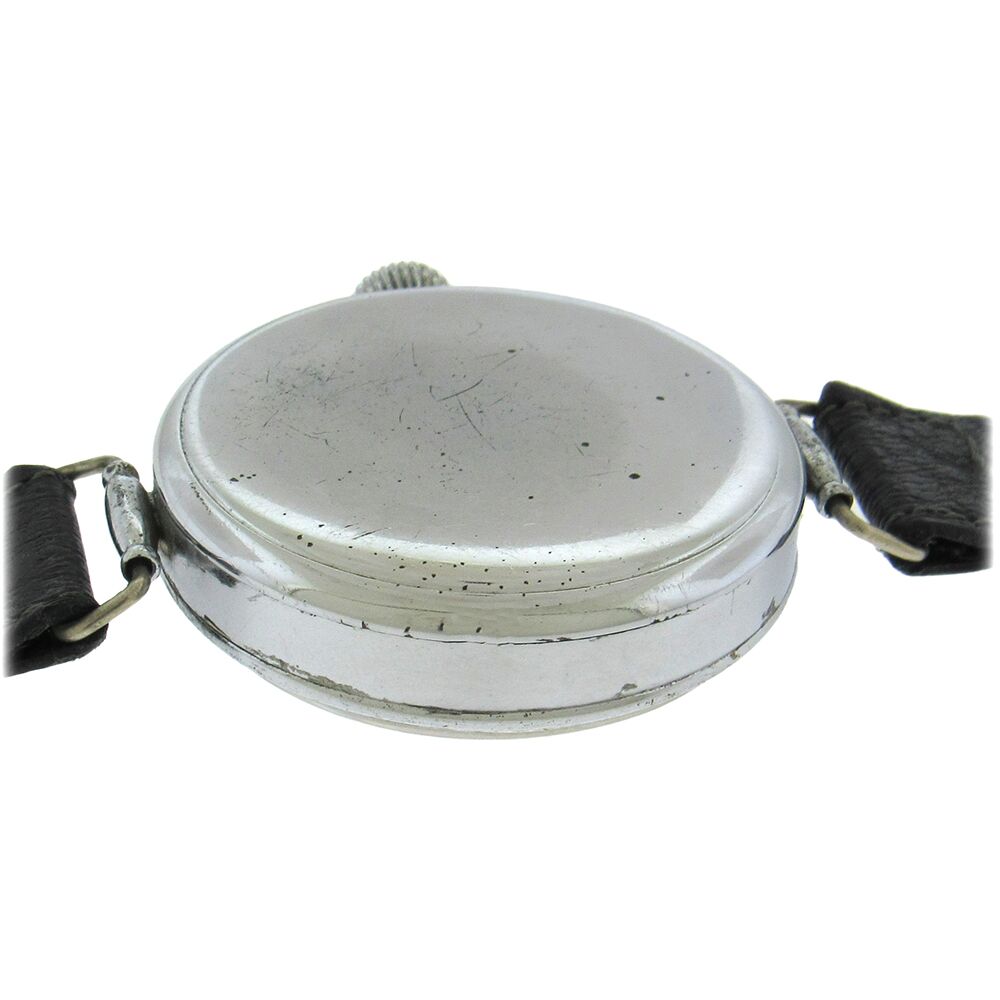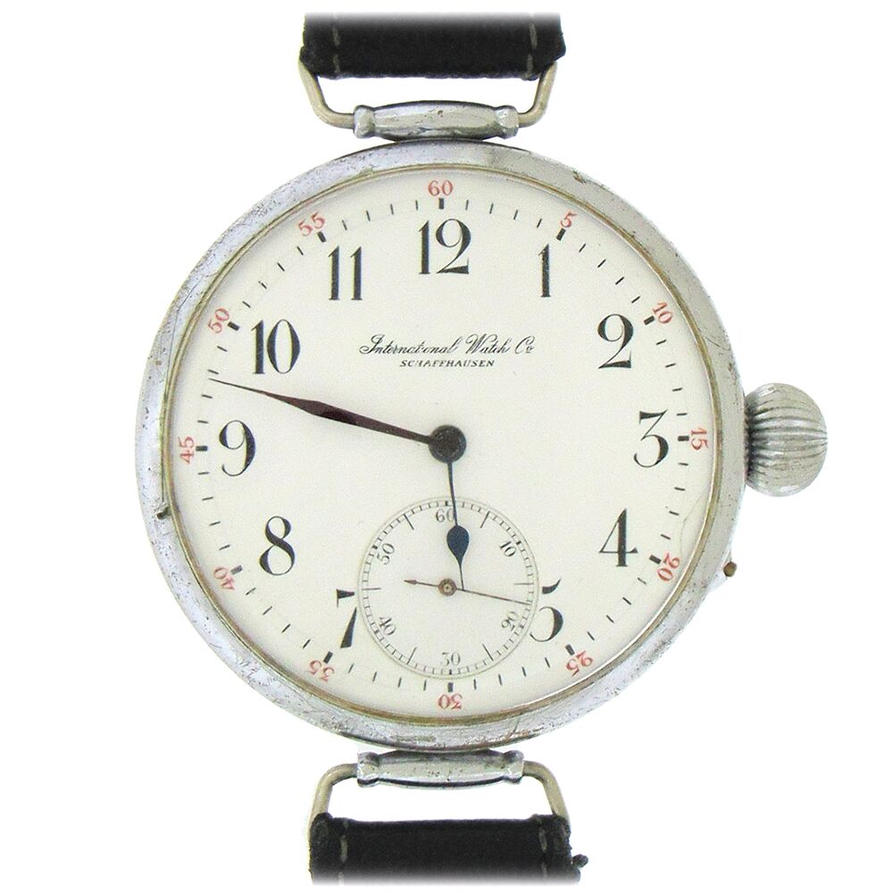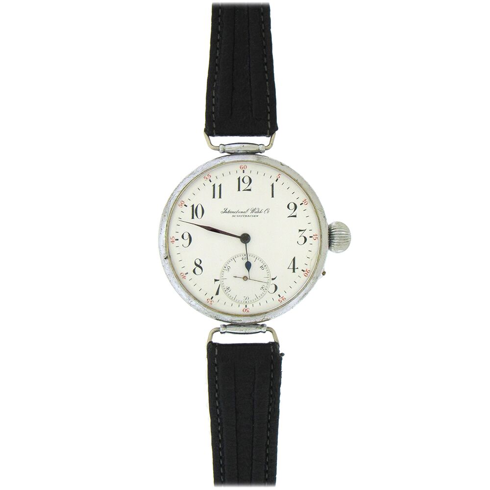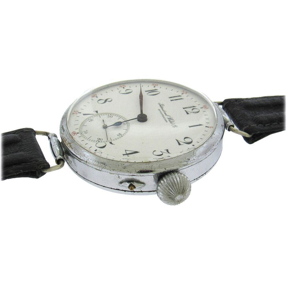 Style — oversize style — rules in this jumbo 47mm steel pocket watch case converted to a wristwatch. IWC porcelain dial, blued steel spade hands, sunken subsidiary seconds dial, pleated oversize crown, outer red minutes chapter, snap back. 17mm thickness. These converted pocket watches are fun for style, are well constructed with excellent movements. Warrantied for 12 months.