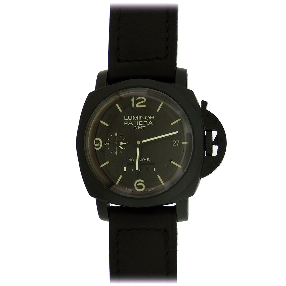 Hard to find Panerai {Pam 335 10 Day GMT ceramic automatic, this statement sports watch measures 44mm, its black ceramic case with see-through back, black dial with constant seconds and AM/PM indicator at 9 o’clock, 10 day power reserve indicator at 6, date window at 3, luminous numeral and baton hour markers and second time zone arrow hand. The self-winding movement is warrantied by Aaron Faber for 2 years, the watch accompanied by original box and papers.