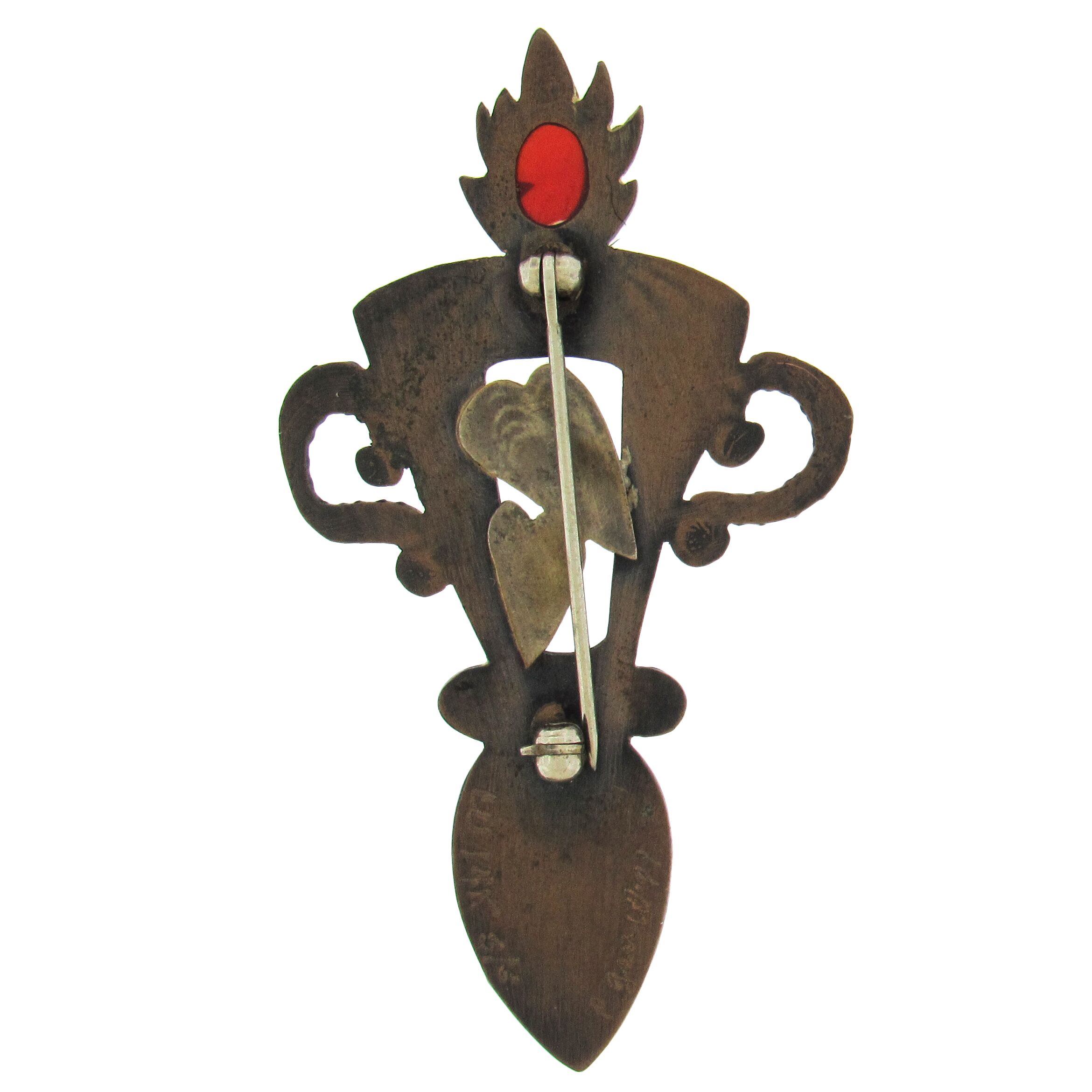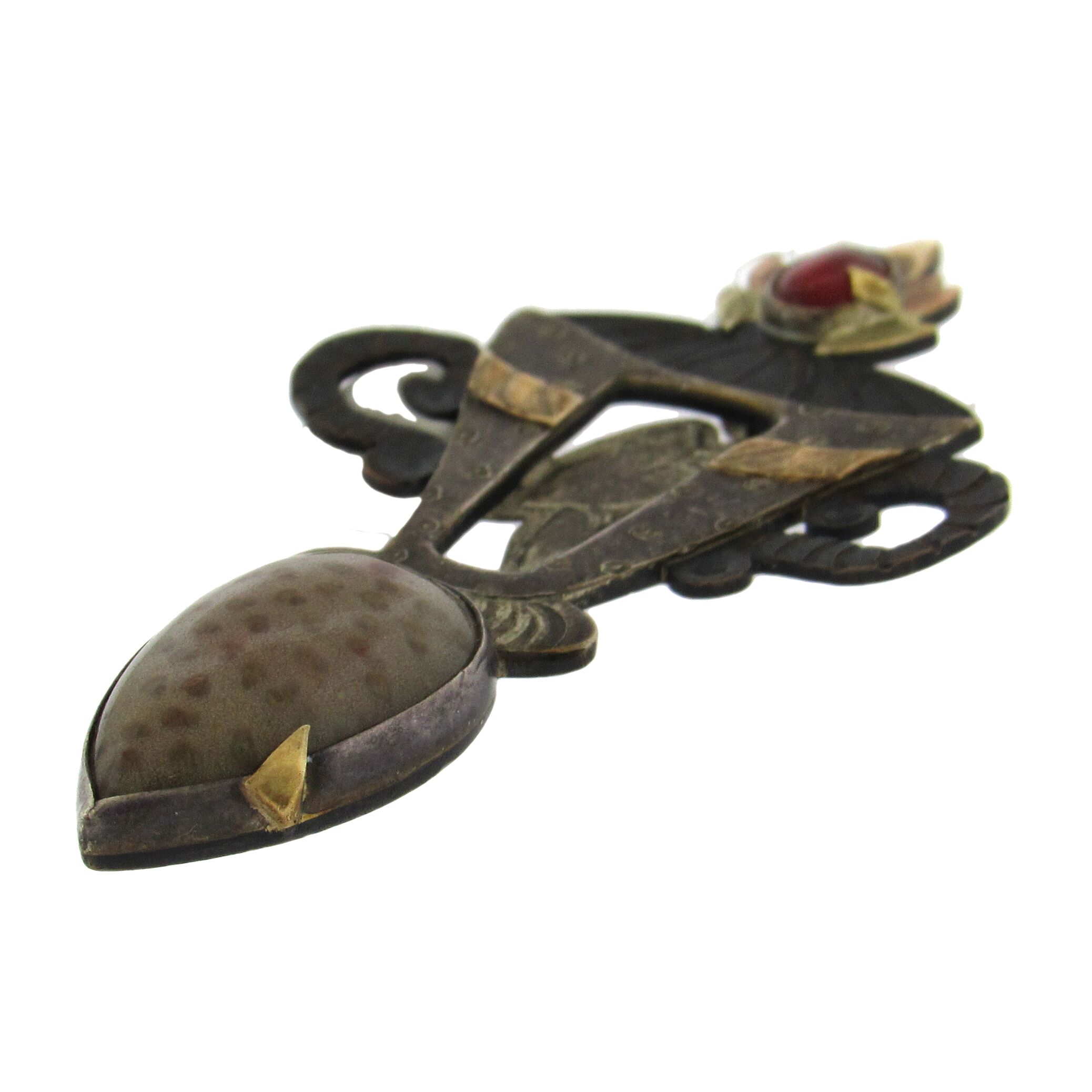 Pat Garrett’s jewels are filled with classic images often interspersed or interrupted by hearts or animals, like this sterling silver brooch with a central trophy set with an oval carnelian cabochon, and revealing two hearts, with a pear-shape leopard spot agate. Dated 1991, in copper, sterling and 14K gold.