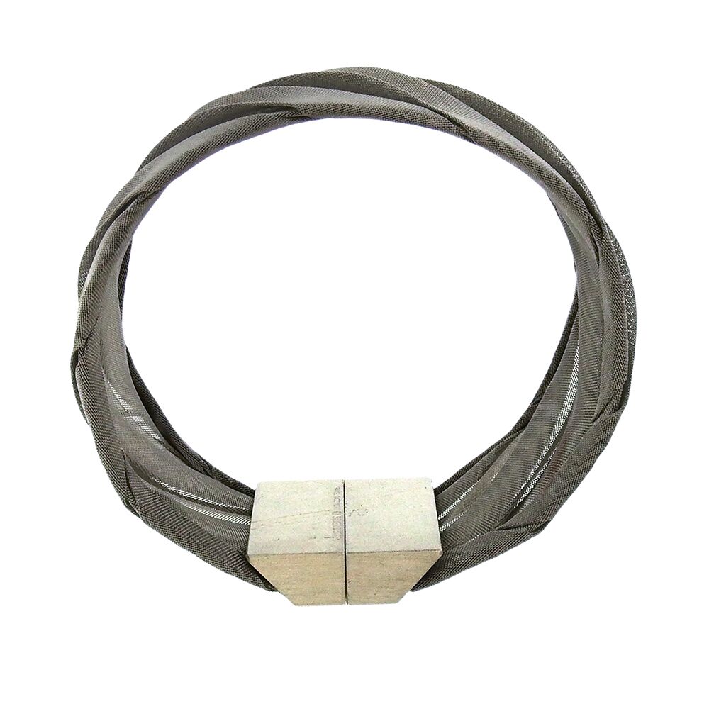 Stainless gray steel mesh bracelet from Pawel Kaczynski pairs with his V-form mesh necklace, but is perfect also on its own, the 1-1/8″ wide fabric-like mesh diagonally pleated and folded with a magnetic sterling silver clasp.